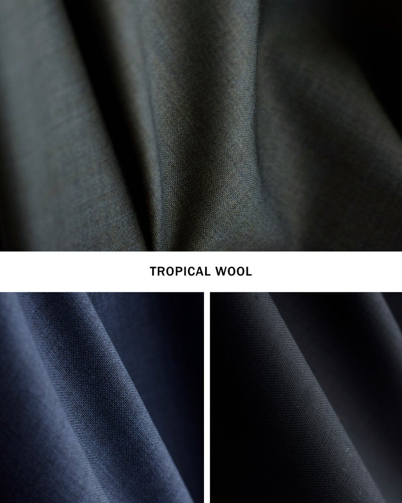 ■トロピカルウール100%非常に軽やかで薄手ながらも防シワ性もあり、素肌にも心地よいタッチでデイリーに扱って頂けるサマーウール。動くたびに美しいドレープを描きます。しっとりとした肌当たりと自然な光沢感があり、春先から、夏、秋へと移り変わる時期にちょうどいい着用感。蒸れにくくドライな肌触りで、長時間の着用でも美しい印象をキープします。