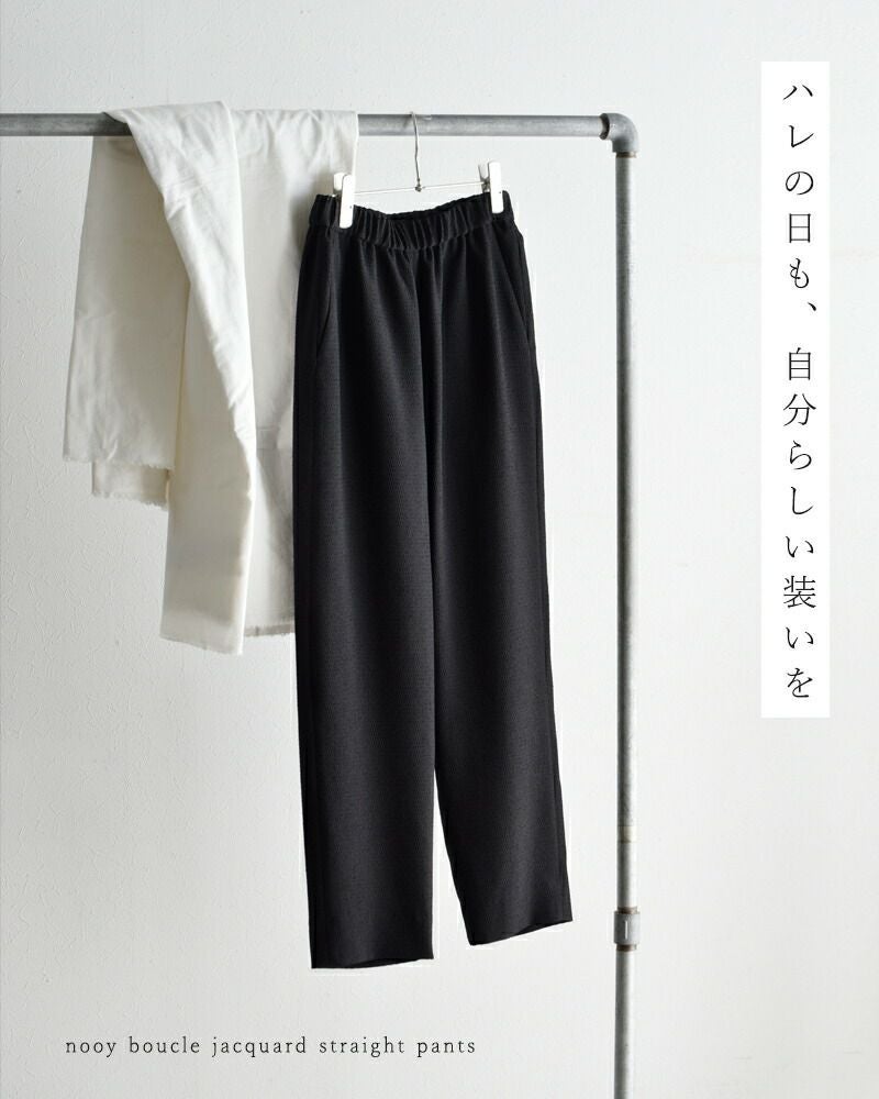 nooy(ヌーイ)より、フォーマルにぴったりなブークレジャガードブラック ストレートパンツをご紹介します。オケージョンシーンに洗練された装いを演出するnooyの人気シリーズ。ゆったりとしたストレートシルエットはトレンド感もあって、優雅なブークレジャガードが気品を携えます。フォーマルだけでなく、普段使いにもお使いいただけるので、様々なコーディネートで活躍してくれます。