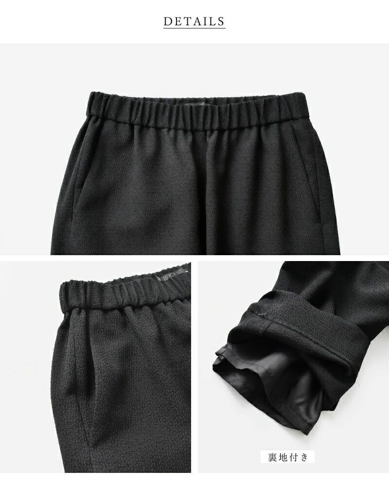 ウエストはゴム仕様で楽な穿き心地です。シャーリングが美しいので、ゴムウエストでもトップスインが美しくキマります。