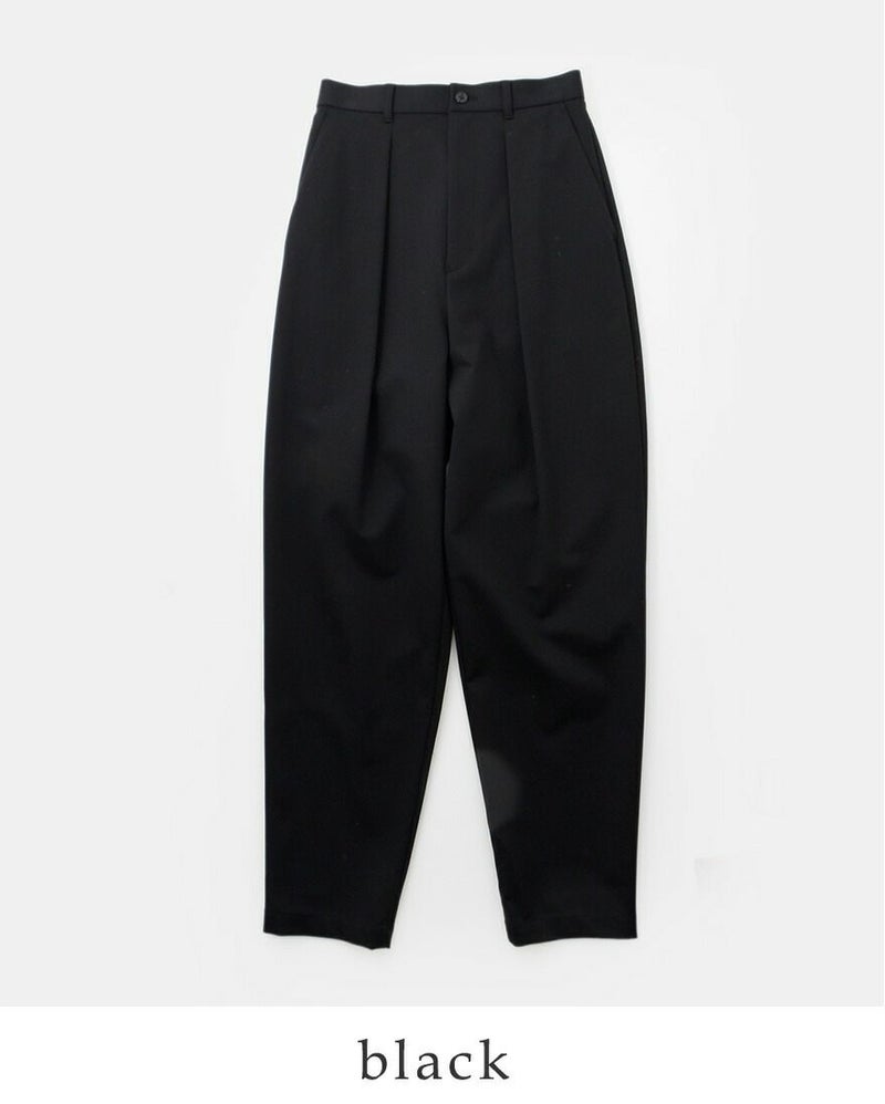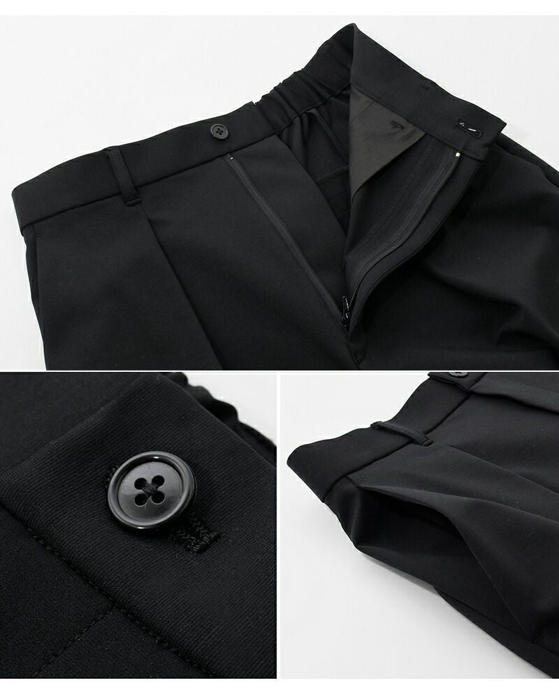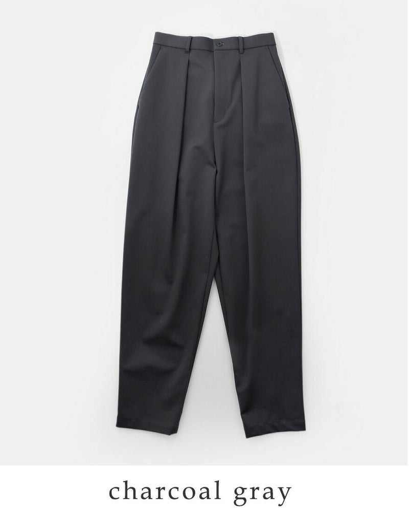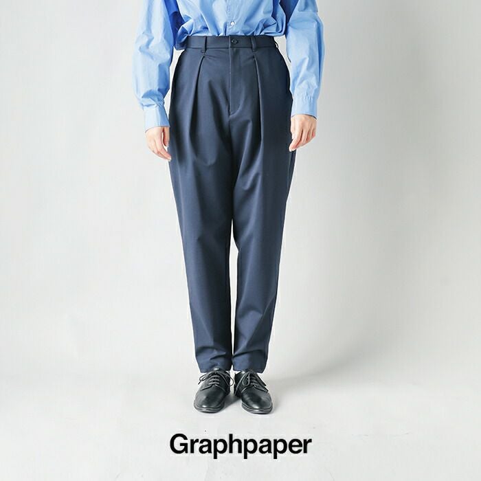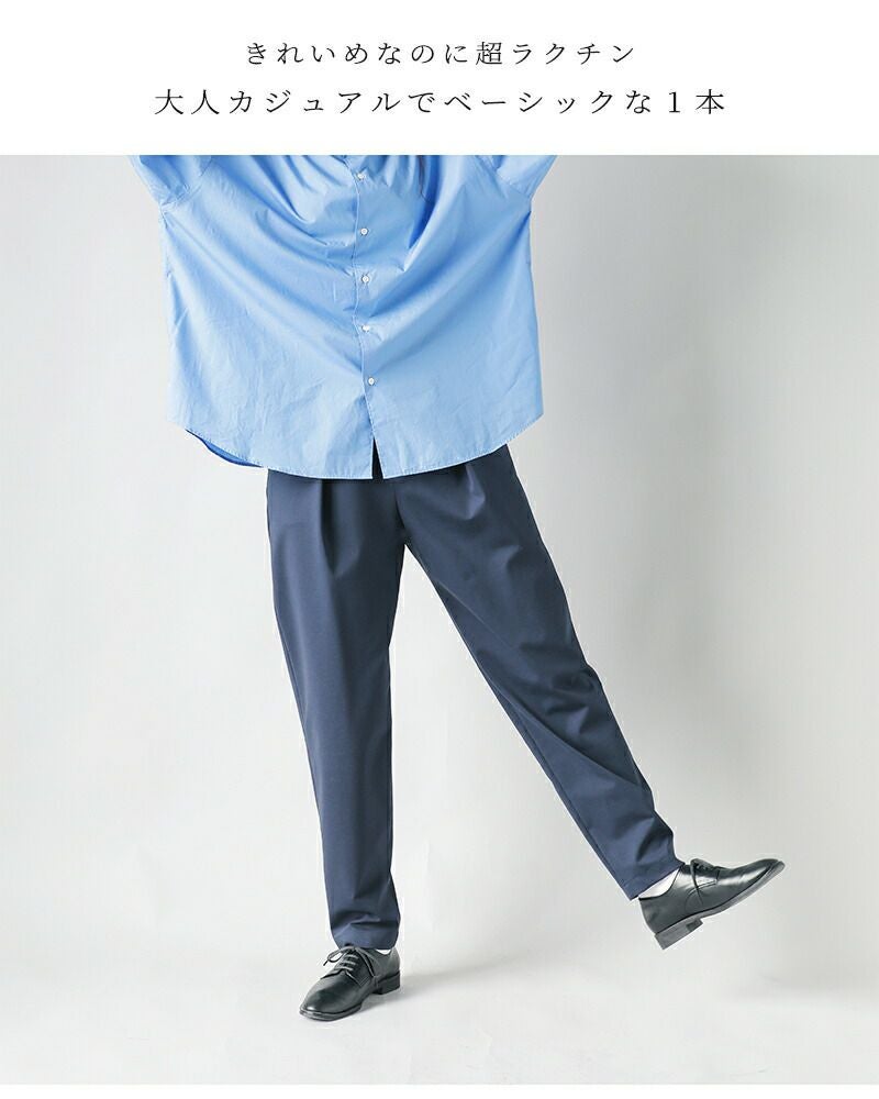 graphpaper(グラフペーパー)より、コンパクト ポンチ イージー トラウザーズ “Compact Ponte Easy Trousers” をご紹介します。 後ろベルトにゴムを配してヒップまわりには程良くゆとりを持たせたイージーなフィット感が嬉しいテーパードトラウザー。布帛のように見えて縦横にストレッチ性のあるハイゲージのポンチ素材を使用しており、穿き心地はリラクシーながら、テーパードシルエットできちんと感があります。ウェストに深めのタックを入れることで、タックインスタイルが格好良くきまる、スマートな1本です。