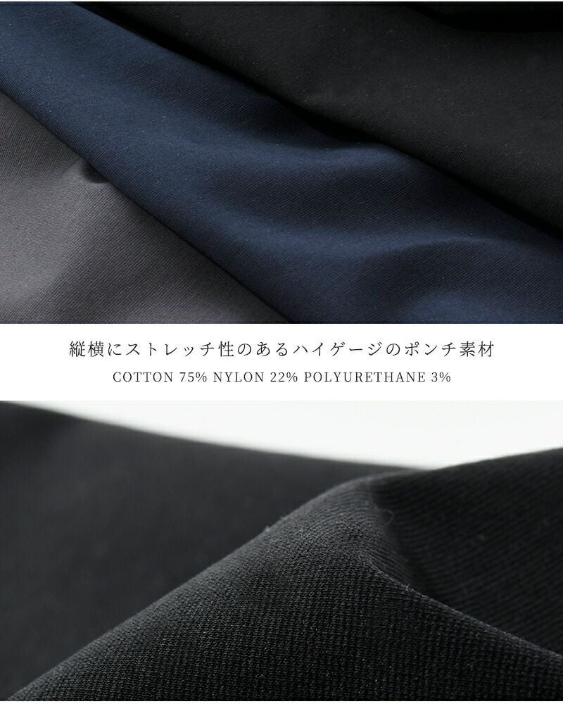 コットン 75% ナイロン 22% ポリウレタン 3% シワになりにくく、型崩れしにくい、ストレッチ性があるポンチ素材。 布帛のように見えて、縦横にストレッチ性のあるハイゲージが上品な雰囲気。
