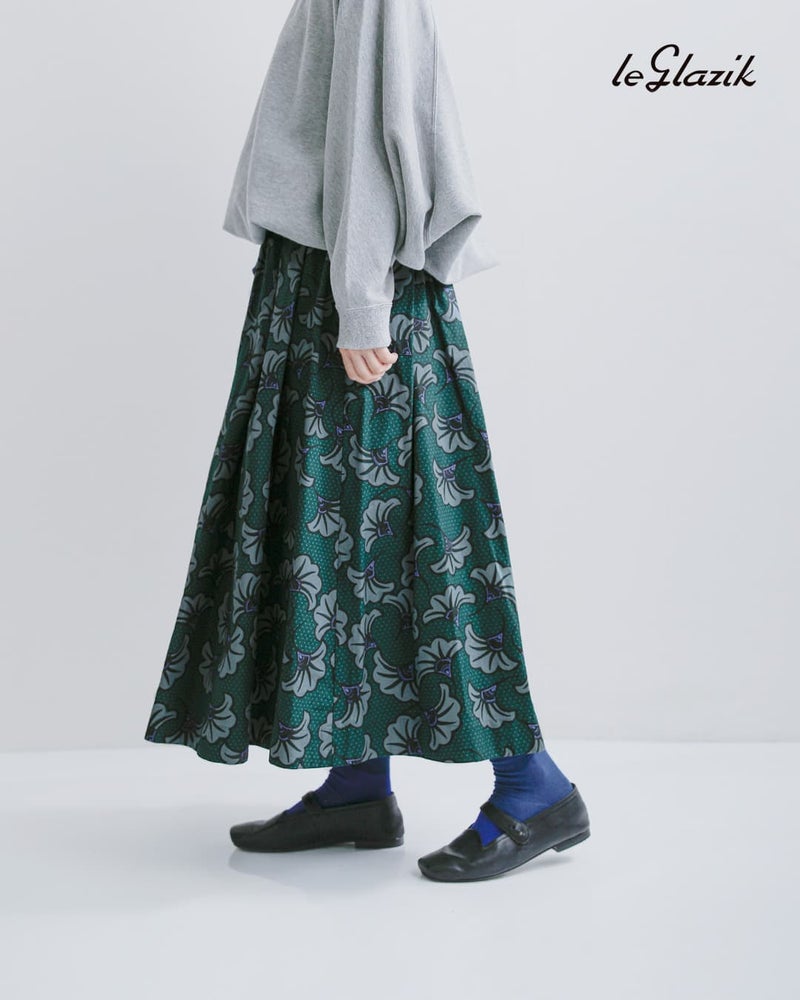 Le Glazik(ルグラジック)より、コットンバティックプリントタックギャザースカートのご紹介です。アフリカンバティックから着想を得たオリジナルプリントが目を惹くスカート。程よくハリ感がある素材なのでカジュアルになり過ぎず大人カジュアルに最適な一枚に仕上げられています。たっぷり広がるフレアなデザインと、存在感のある色彩と柄でコーディネートの主役になる一枚です。