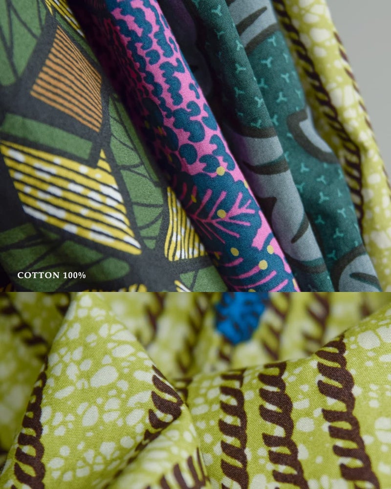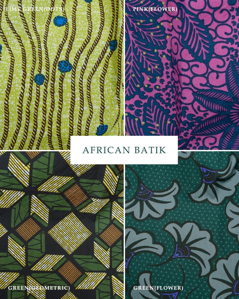 アフリカンバティックから着想を得たオリジナルプリント、LE GLAZIKのオリジナルバティック素材。伝統的なアフリカンバティック柄を、年齢を問わず着やすいように色合いや柄を調整しました。
