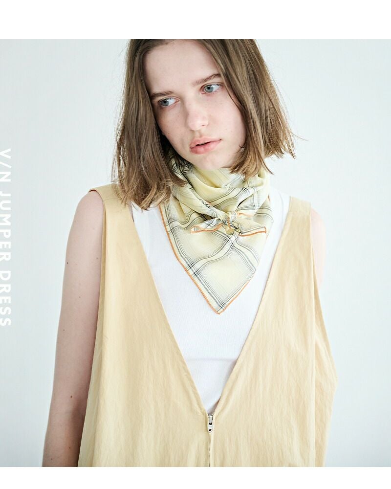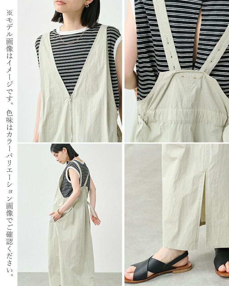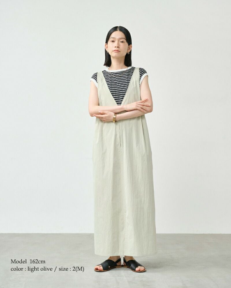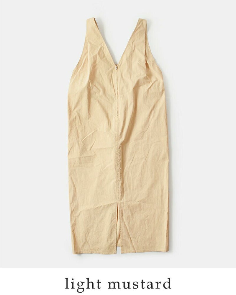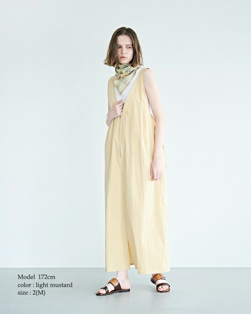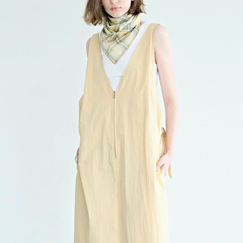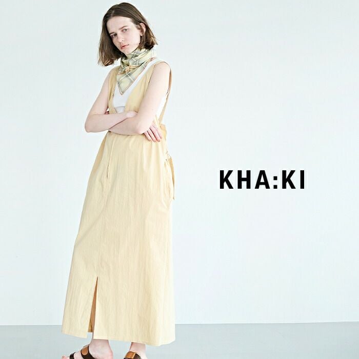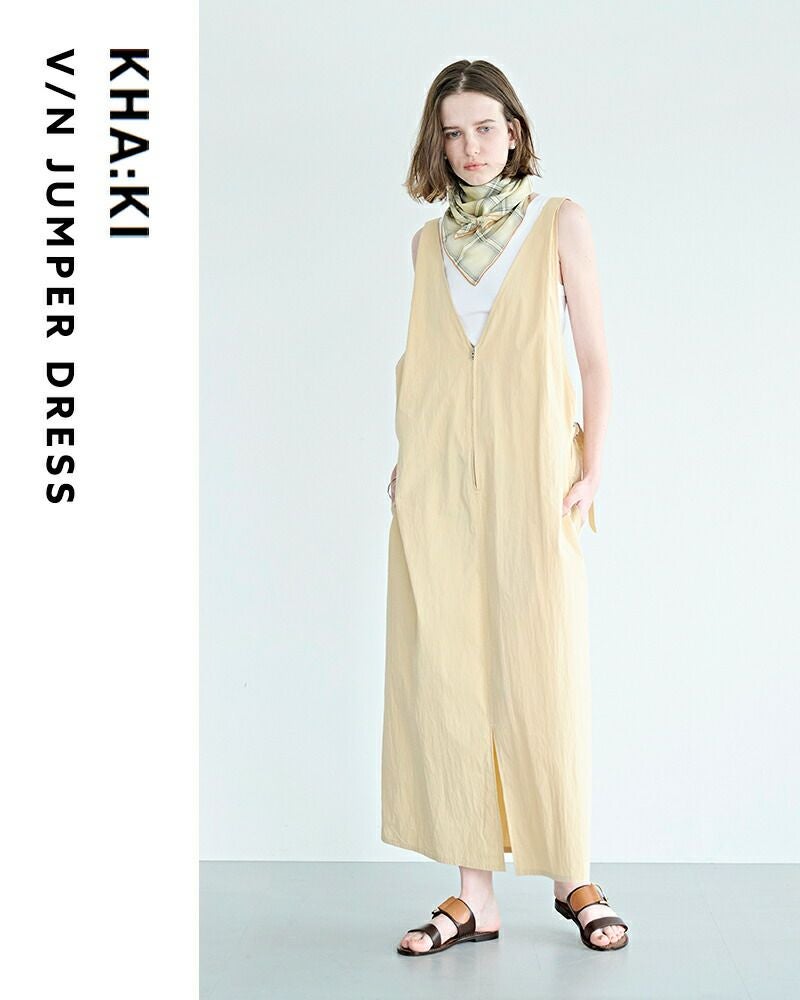 kha:ki(カーキ)よりライトウェザー Vネック ジップアップ ジャンパードレス “V/N JUMPER DRESS”のご紹介です。深くシャープに開いたVネックが印象的な、洗練された佇まいのジャンパードレス。フロントのジップデザインが程よいアクセントとなり、甘さを抑えた大人のレイヤードスタイルを楽しめます。肩にはタックを施し、動きに合わせて自然な立体感が生まれるフォルムに。後ろウエストにはベルトを配し、シルエットの調整が可能です。肩紐は三段階で長さを変えられるため、合わせるインナーや気分に応じた着こなしが叶います。カットソーやシャツ、タートルネックまで幅広いアイテムと相性が良く、スタイリング次第で表情を変えてくれる一着です。