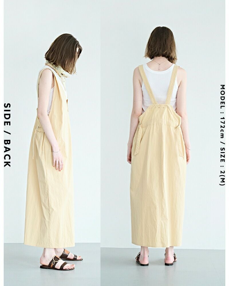 ■後ウエストはベルトでシルエットの調整が可能、肩紐も三段階で長さの調整ができます。 ■フロントはファスナーあき、サイドにはシームポケットがつきます。 ■フロント裾にはスリットあきがあります。
