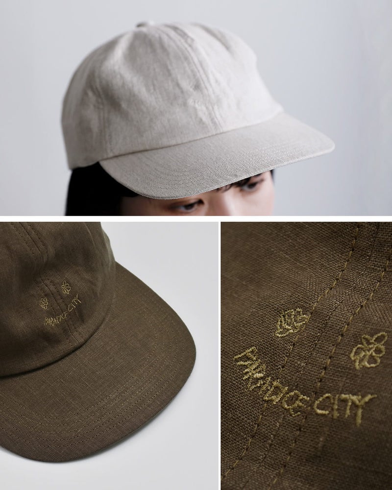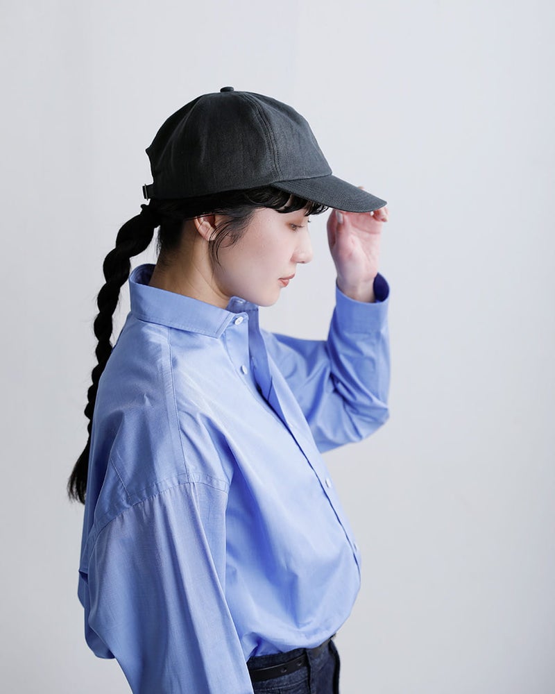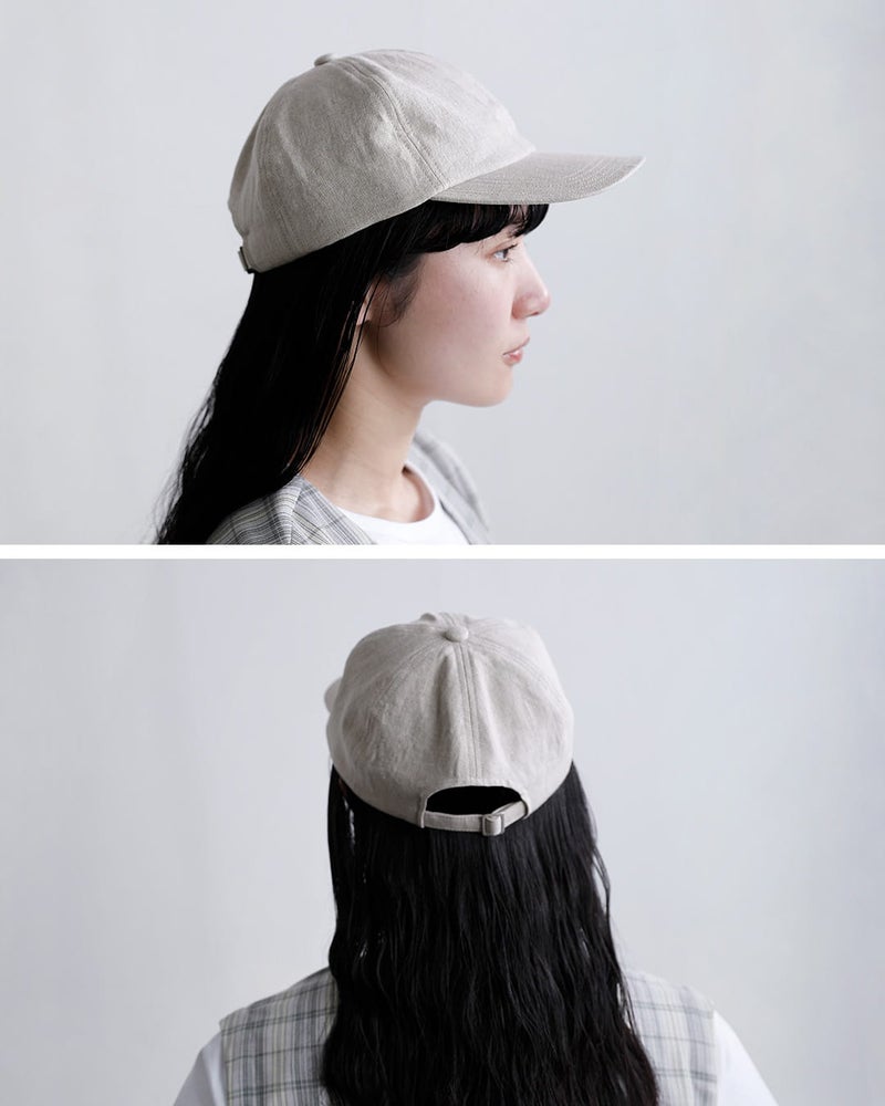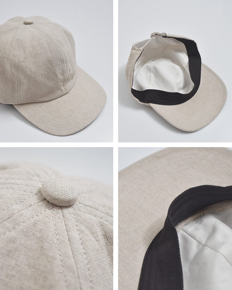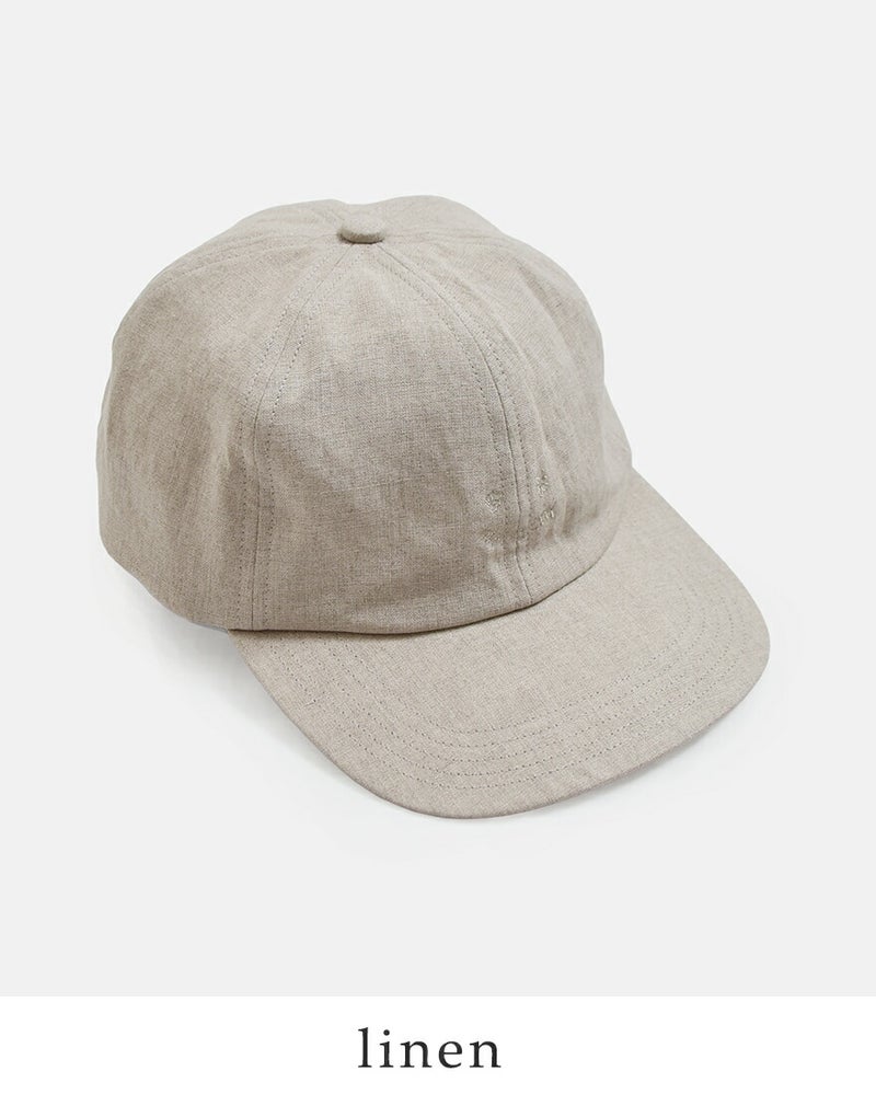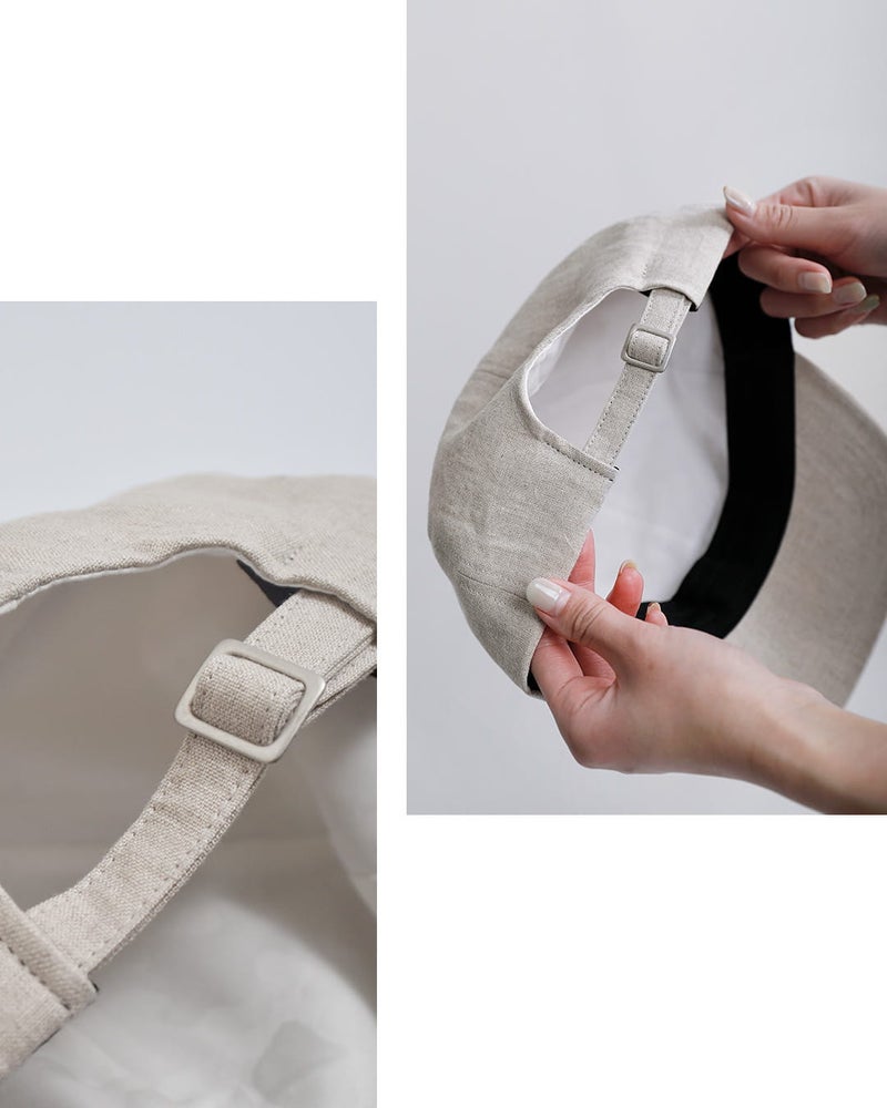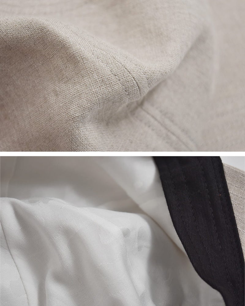 ●本体:麻100% 裏地:綿100% / 日本製本体には通気性に優れた麻素材を使用し、ナチュラルで清涼感のある風合いが魅力です。さらに染色後にひと手間加えることで、リネン特有のハリ感を程よく抑え、柔らかくふっくらとした肌触りに仕上げています。裏地には綿を使用しており、肌当たりも優しく、快適な被り心地を実現しています。