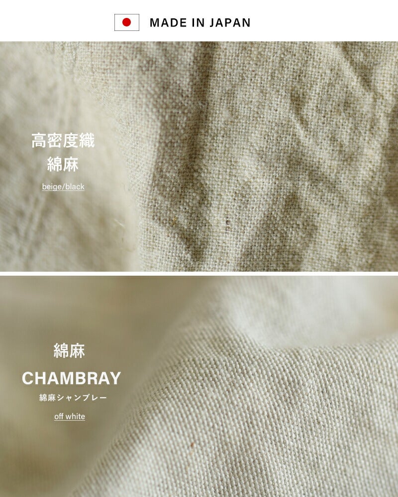 麻60%・綿40%を高密度に織り上げた上質な綿麻生地。麻ならではのシャリ感と通気性に、綿のやわらかさを加え、肌あたりのよい快適な着用感。ほんのり起毛感・独特のシワ感がナチュラルな表情に。