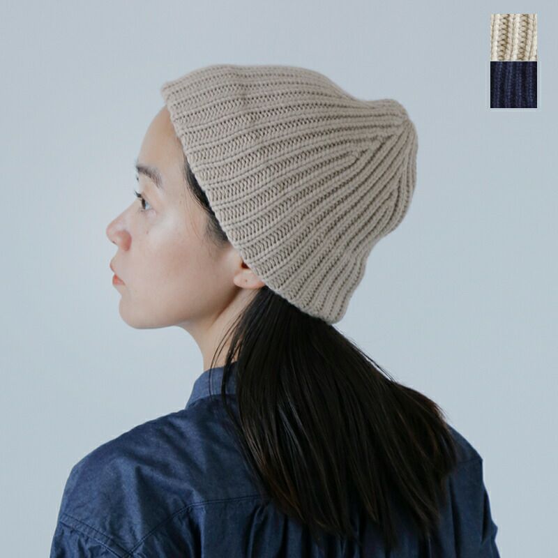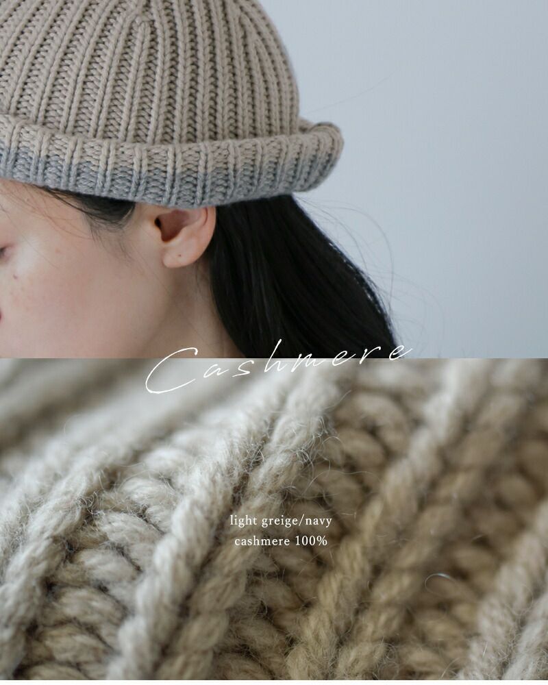 mature ha.(マチュアーハ)より、カシミヤ100%スラントカッティングニットキャップ “slant cutting knit cap”のご紹介です。カシミヤ100%の糸を贅沢に使用したローゲージのリブ編みでボリューム感のある肉厚なニットキャップ。滑らかで暖かく、かぶり心地の良さも魅力です。シンプルにそのままで被ったり、折り返して配色をみせたり色々アレンジが効くのも魅力的です。