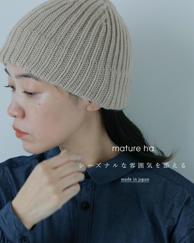 裾が斜めにカットされた mature ha. 定番ニット帽は、前方が少し長めになっており、かぶるとトップの先が後頭部に来てシャープな横顔をつくります。