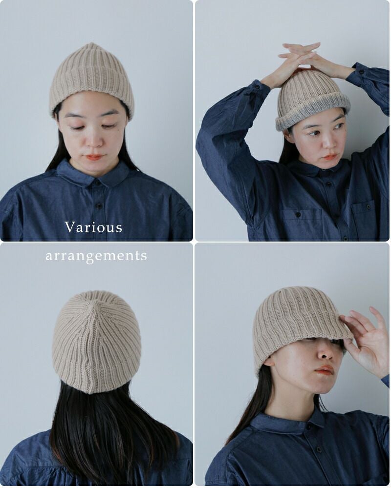 カジュアルに浅めにかぶったり、ぐっと深めに被ってマニッシュにきめたり、折り返して配色を見せたり、いろんな被り方ができます。スタイリングによってアレンジできるから、着こなしの幅も広がります。