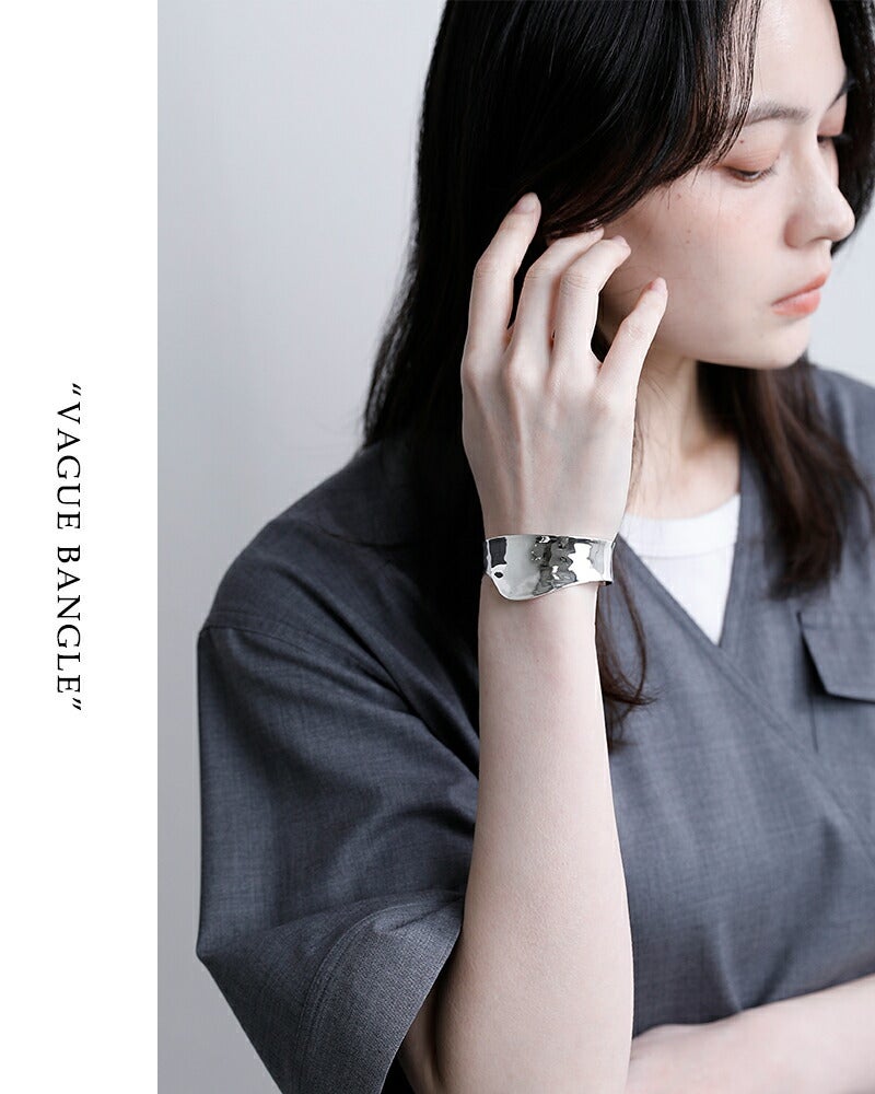 フランス語で“波”を意味する「VAGUE(ヴァーグ)」。その名の通り、寄せては返す波のように柔らかな曲線が特徴のワイドバングルです。あえて左右非対称で形に捉われないフォルムに仕上げることで、決まった正解のない、身につける人の感覚に訴えかける自由な美しさを表現しています。