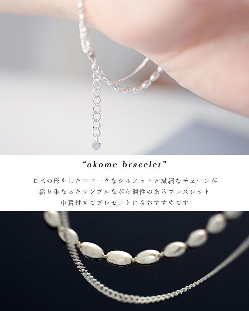 aura(オーラ)より、シルバー925 ブレスレット“okome bracelet”をご紹介します。お米の形をしたユニークなチェーンと小粒のチェーンの2連タイプのブレスレット。肌馴染みの良いシルバーがさりげなく存在感を放ち、手元を華やかにしてくれます。華奢で品のあるアイテムですが、デイリー使いからドレスアップスタイルまで幅広くお使い頂けます。