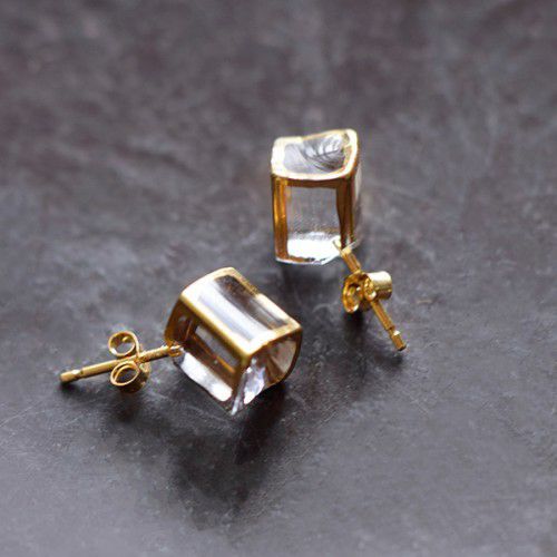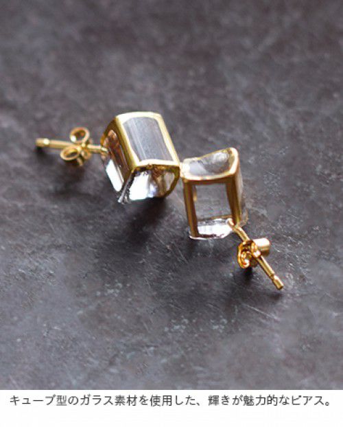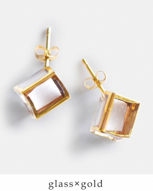 sorte(ソルテ)より、ガラスキューブピアスのご紹介です。ガラスに金彩を施した、透明感と輝きが美しいキューブ型ピアスです。兵庫県篠山市福住にある吹きガラス工房で、一点一点丁寧に手作業で制作されています。ガラスを棒状に伸ばして金太郎飴のようにカットし、断面のいびつさをデザインとして残しながら滑らかに磨き上げています。一つ一つ形が違うのも手作りならではの魅力。ガラス本来の美しさとゴールドの華やかさの絶妙なコンビネーションを楽しめる、大人の女性にぴったりのアイテムです。