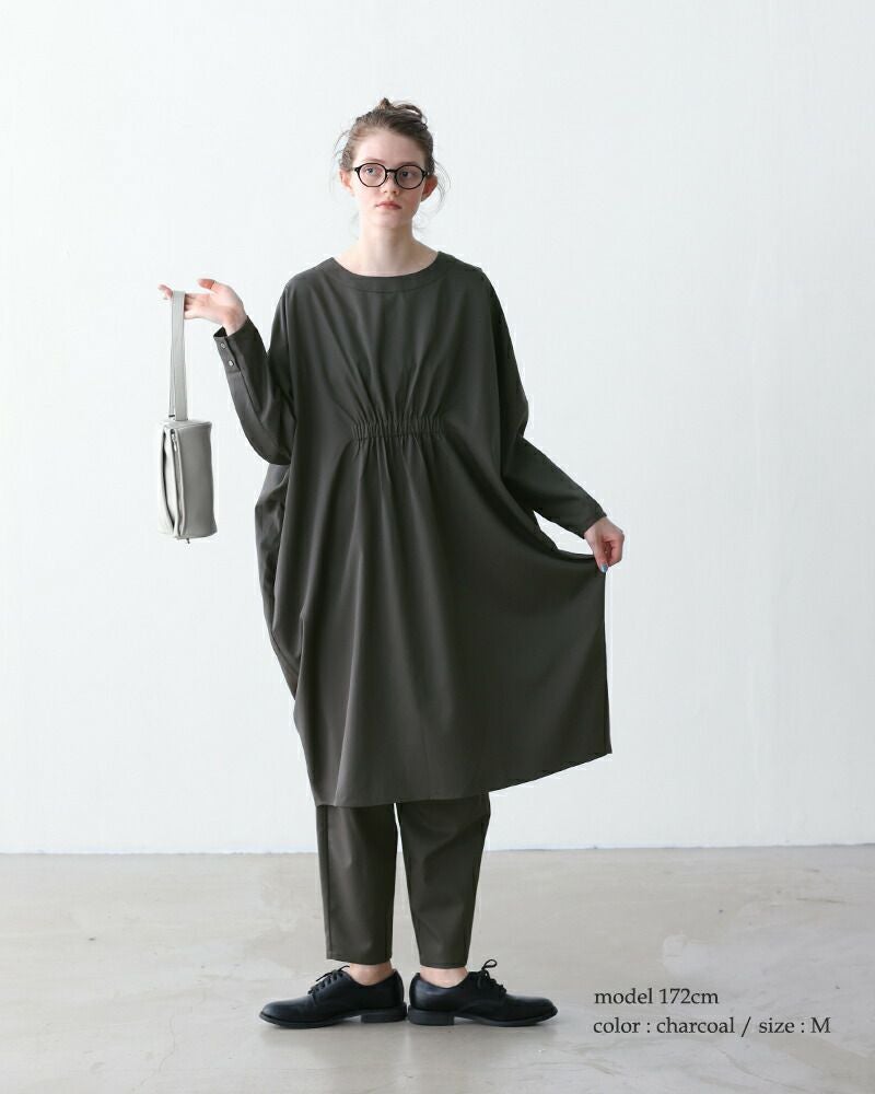 フロントウエスト部分に施された巧みなギャザー使いがポイント。身幅をたっぷりととり、生地を贅沢に使ったコクーン型のシルエットです。