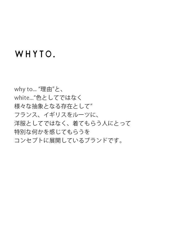 why to... “理由”と、 white...“色としてではなく様々な抽象となる存在として” フランス、イギリスをルーツに、 洋服としてではなく、着てもらう人にとって 特別な何かを感じてもらうを コンセプトに展開しているブランドです。