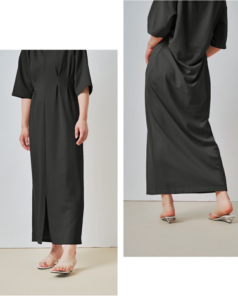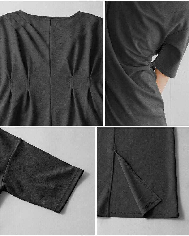 バストの下あたりと、肩、後ろウエストにタックが入り、計算されたシルエットを作り出しています。広めの袖口で腕も細く見せます。