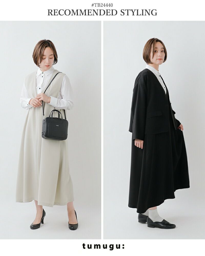 tumugu(ツムグ)よりソアパール コンパクト ジャンパー スカートのご紹介です。シンプルな中に上品さと可愛らしさを感じるジャンパースカート。シワになりにくい高機能素材を採用し、普段使いからビジネスシーン、さらにはオケージョンまで幅広く対応可能です。しなやかなドレープ感、マットな質感、ふくらみのある素材が生む気品は、ツムグらしいこだわりのアイテム。深めのVネックやデザインに馴染むポケットなどの細部まで洗練されたディテールが、シンプルでありながら存在感を放ちます。どんなシーンでも活躍できるこの一着で、大人の洗練された装いをお楽しみください。