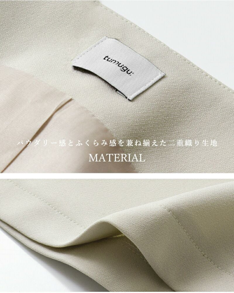ハリとしなやかさを兼ね備えた二重織り生地が、程よい厚みとパウダリーな質感を実現。速乾性に優れ、シワになりにくいのでお手入れが簡単です。美しいドレープ感が上品さを際立たせるだけでなく、蒸れにくく快適な着心地を提供します。