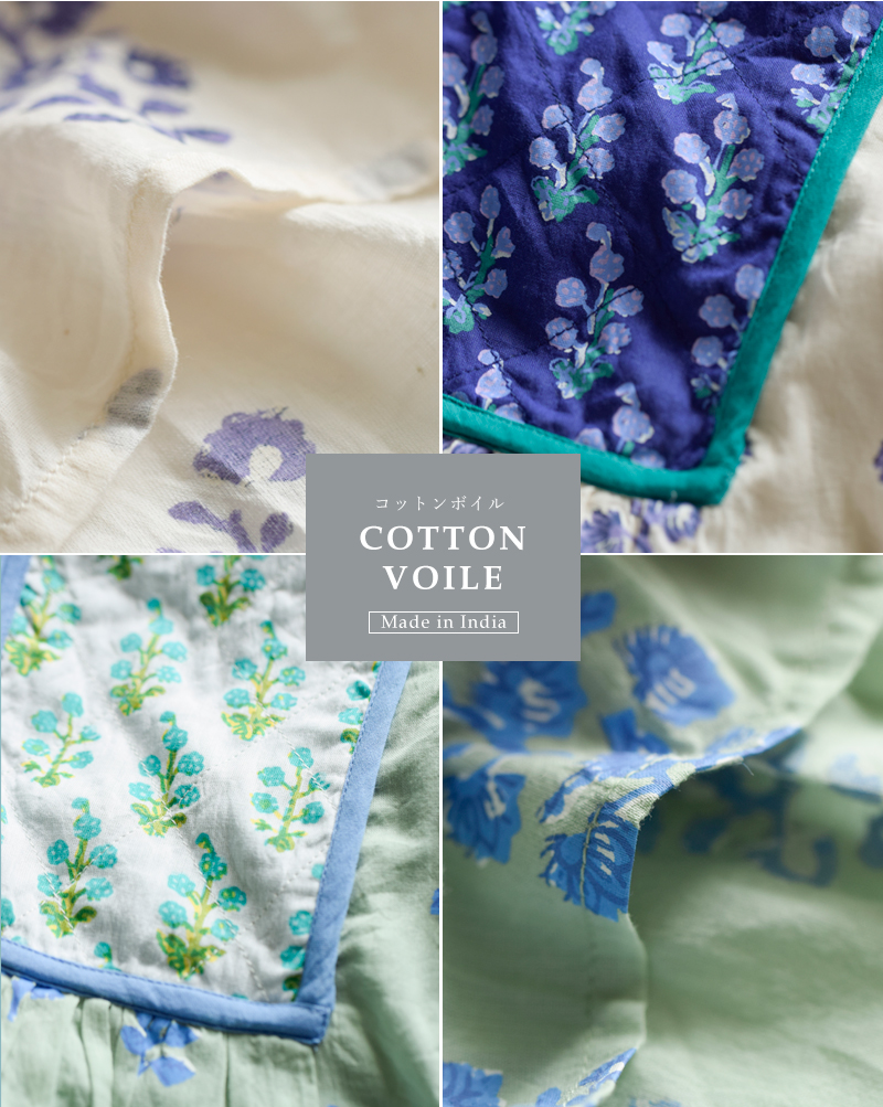 薄手で軽く、ふんわりとしたコットンボイル生地を使用。エアリーで透け感があり、プリントが美しく表現されています。通気性と吸水性に優れており、春夏にぴったりな生地です。さらっとした肌触りと柔らかさのある生地感で着心地も抜群です
