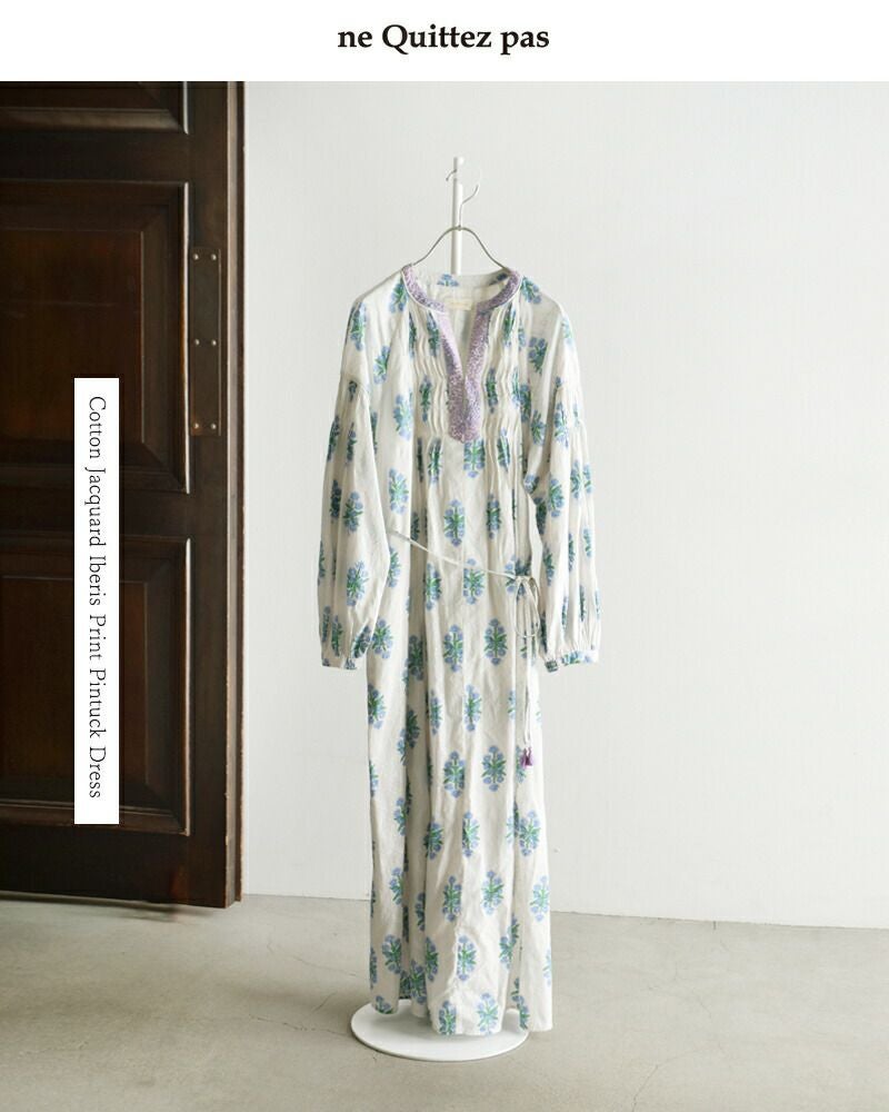 ne Quittez pas(ヌキテパ)より、コットンジャガード イベリスプリント ピンタック ドレスをご紹介します。イベリスの花が静かに咲き誇る、ロマンティックなコットンジャガードドレス。繊細な織り柄とプリントが重なり合い、表情豊かなテクスチャーを演出します。ピンタックが生む縦ラインが、自然とスタイルアップを叶え、さらりと纏うだけで絵になる一枚です。両サイドにポケットつきで、実用性も◎。華やかな装いで、普段使いから、旅行やおでかけなど、様々なシーンでお使いいただけます。