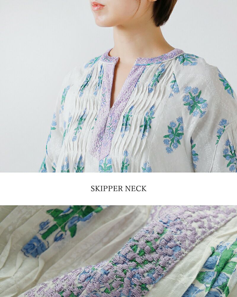 ふんわりと軽やかな、コットンジャガード生地を使用。上品な透け感があり、涼し気で、春夏にぴったりな生地です。素朴でぬくもりのあるイベリスのプリントが可愛らしいです。