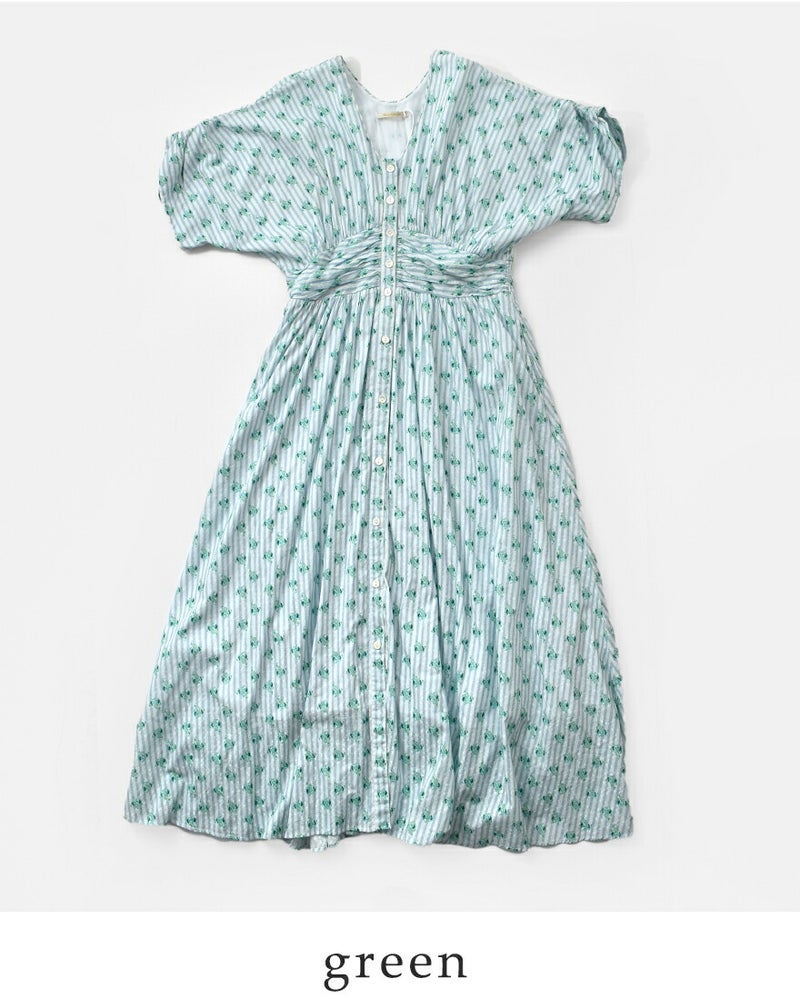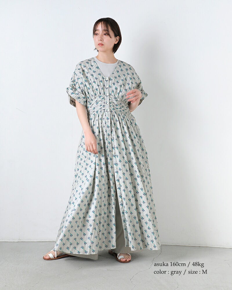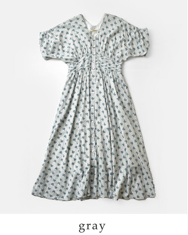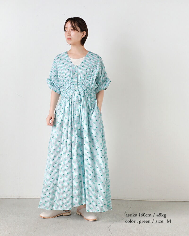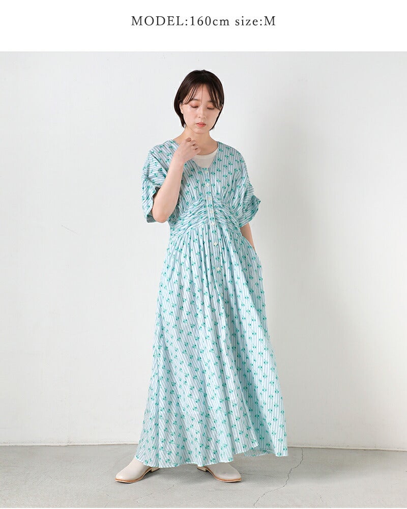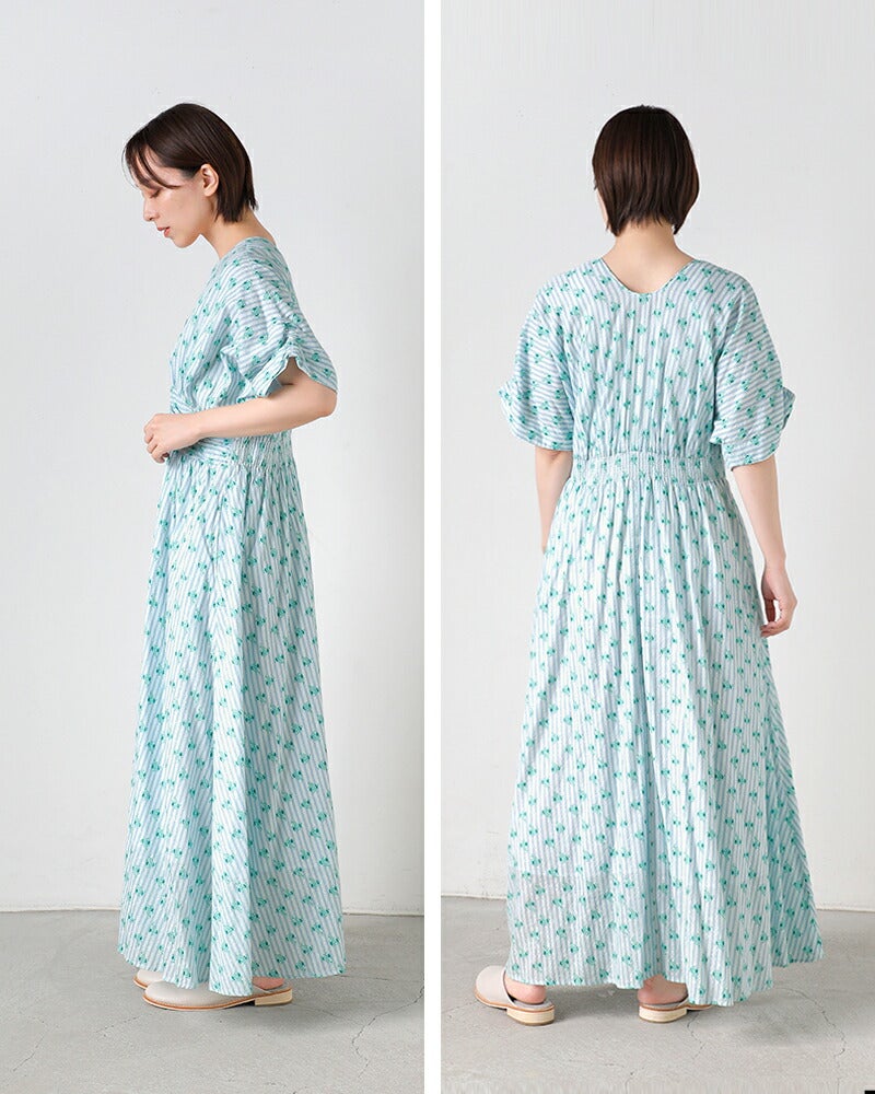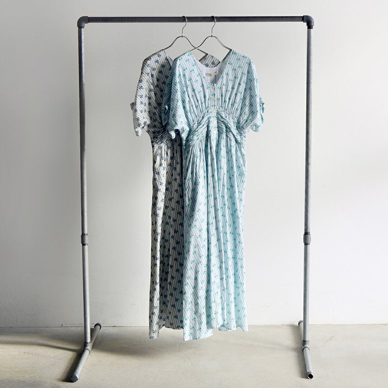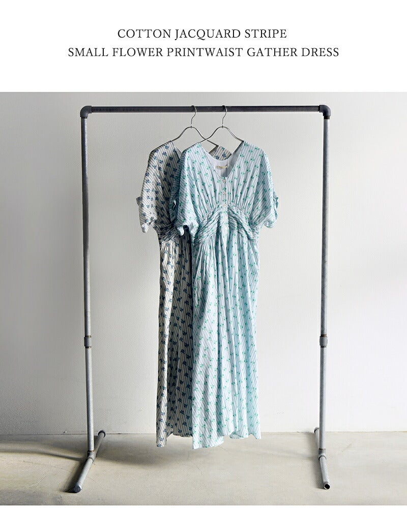 ne Quittez pas(ヌキテパ)より、コットン ジャガードストライプ スモールフラワープリント ウエストギャザー ドレス Cotton Jacquard Stripe Small Flower Print Waist Gather Dress をご紹介します。 ストライプ柄を織りで表現したコットンジャガード生地に、繊細なスモールフラワープリントを重ねた、奥行きのある表情が魅力の一着。 軽やかで通気性の良いコットン素材は、春夏シーズンも快適な着心地を叶えます。 ウエストに施されたギャザーが自然な立体感を生み、身体のラインを拾いすぎない女性らしいシルエットに。 一枚で着映えしながらも主張しすぎず、デイリーからお出かけまで幅広く活躍します。