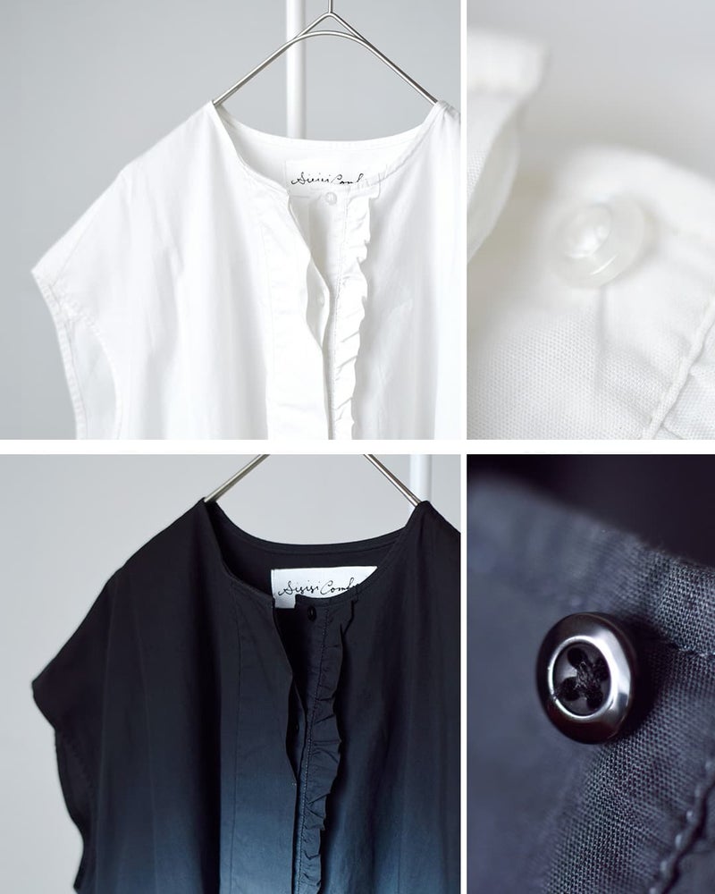 フロントのフリルと比翼仕立てにより、すっきりとした印象に。ボタンは生地本体と同系色でまとめ、統一感のあるミニマルなデザインです。