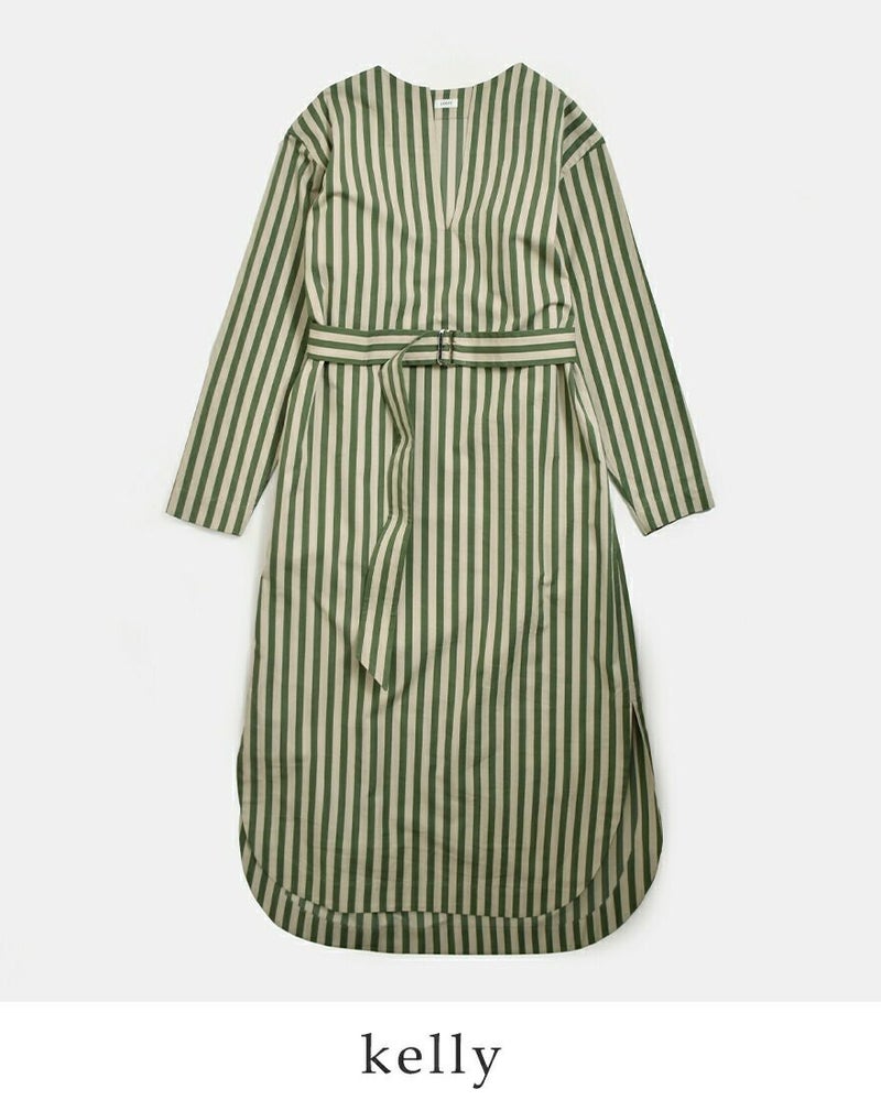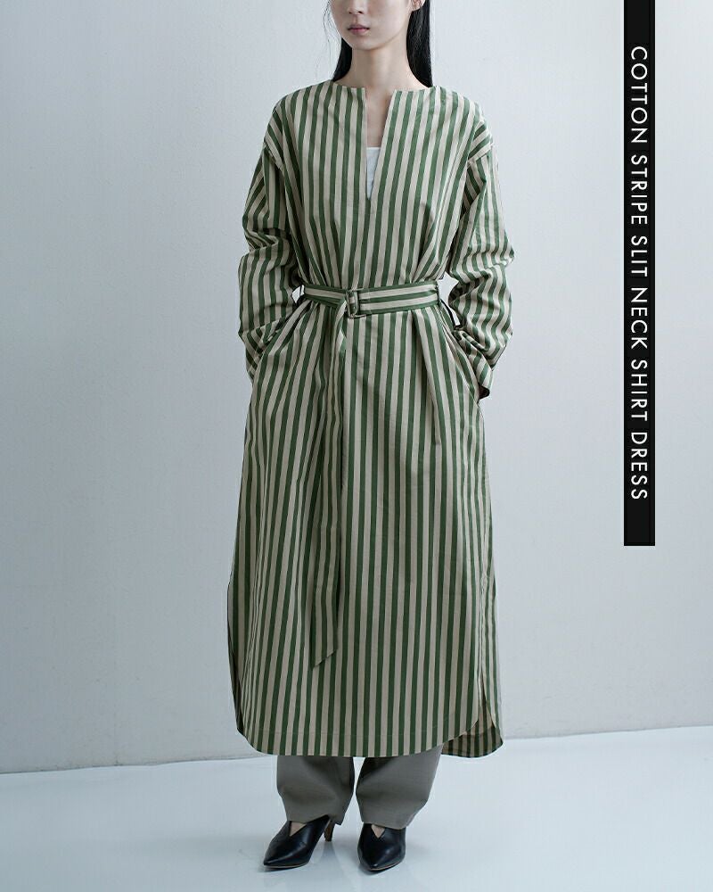 ハリのあるストライプ素材がつくる、凛とした存在感が魅力の一着。ゆったりとしたシルエットにスリットネックの抜け感を効かせ、さらりと着るだけでサマになるシャツドレスです。