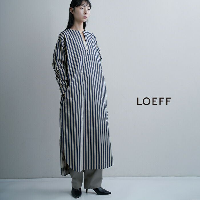 LOEFF(ロエフ)より、コットン ストライプ スリットネック シャツドレス ワンピースのご紹介です。Lyria社のハリとコシ感が素敵なストライプ素材。コットンナイロンのドライタッチでパキッとした風合いが特徴です。ゆったりとしたボディとスリットネック、裾のサイドスリットが軽やかな印象を与えてくれるシャツドレスです。共布ベルトでウエストマークすれば、シルエットのアレンジもお楽しみいただけます。