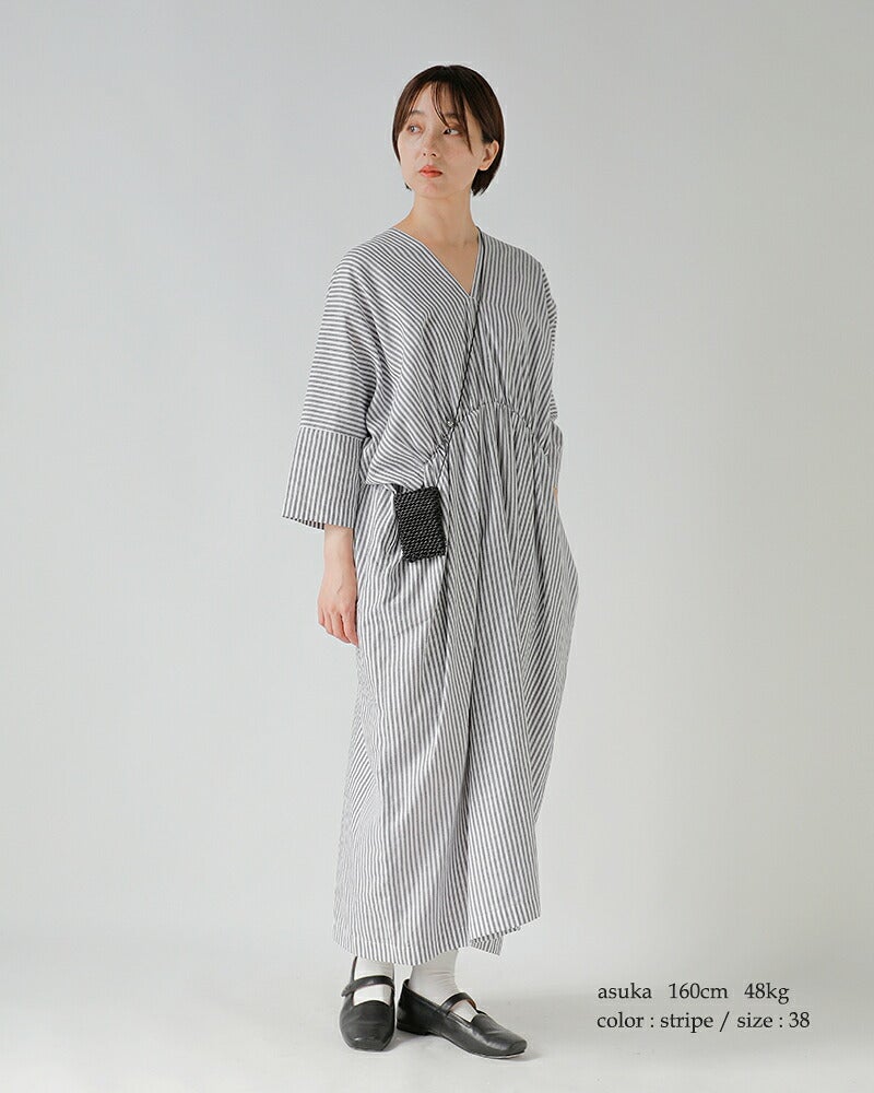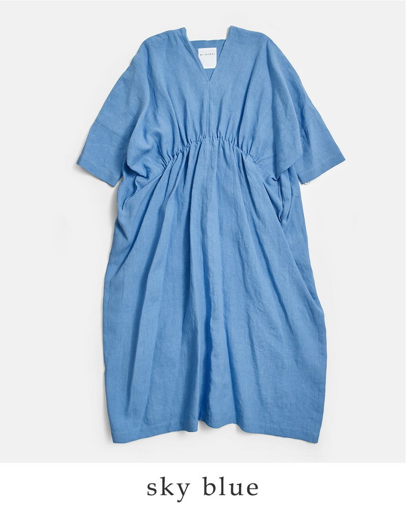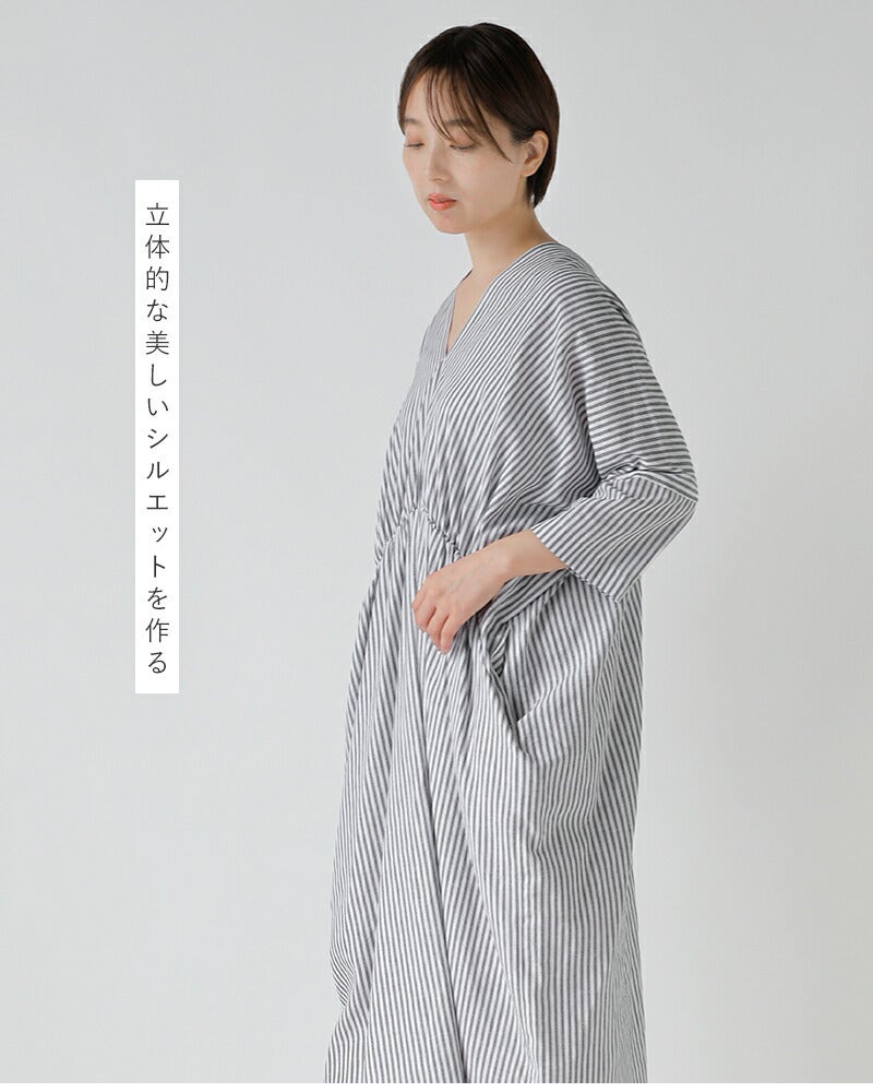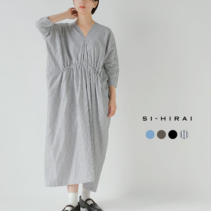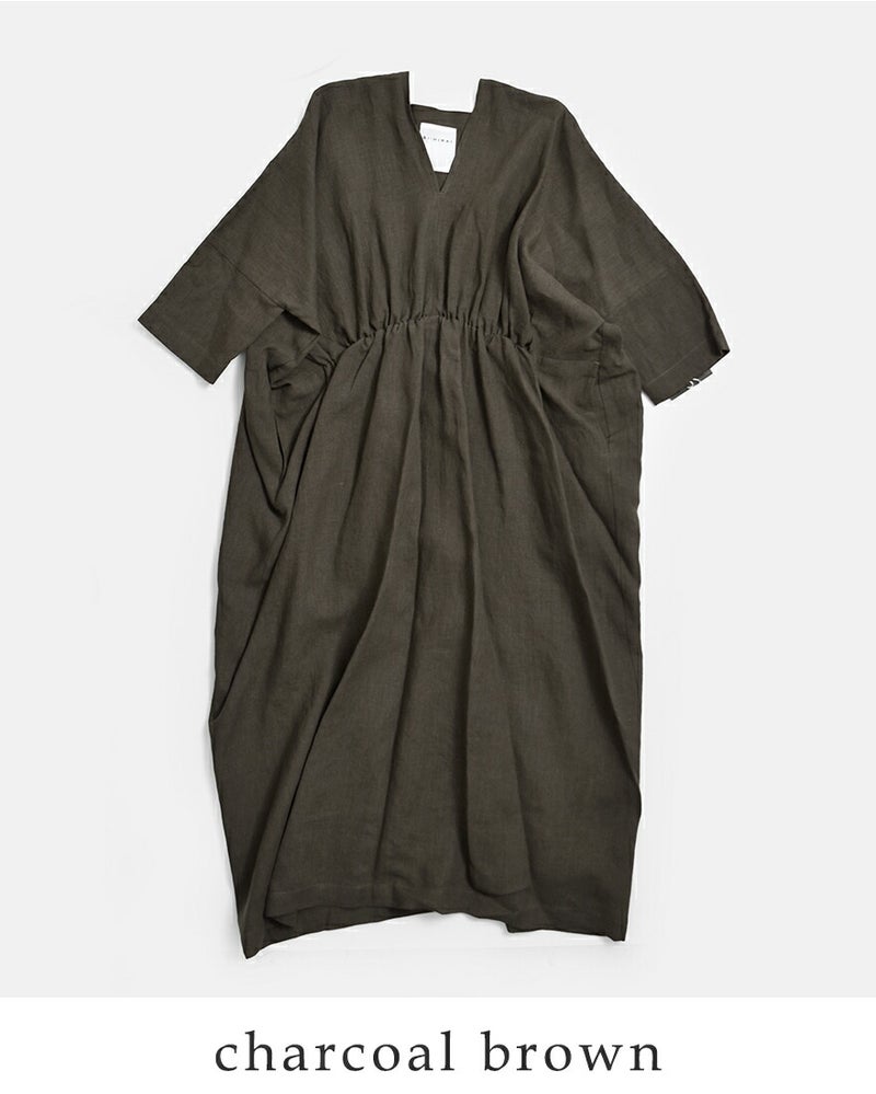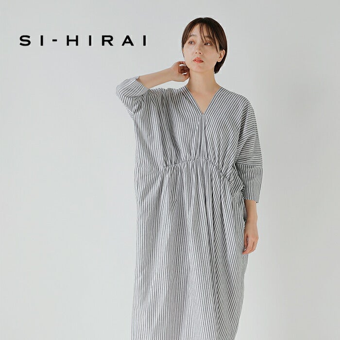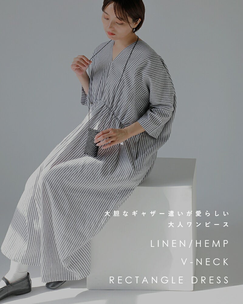 SI-HIRAI(スーヒライ)より、リネン / ヘンプ Vネック レクタングル ドレスのご紹介です。ハリ感のあるさらりとした生地感のリネンとヘンプが心地よいロングワンピース。ウエスト配置のギャザーゴムが生地をたぐりよせ、美しいドレープを作り出しています。そのまま1枚で着てドレスな雰囲気に、レギンスを合わせてカジュアルにな着こなしに。体型カバー効果もしっかりあり、大人のスタイリングにおすすめの1枚です。