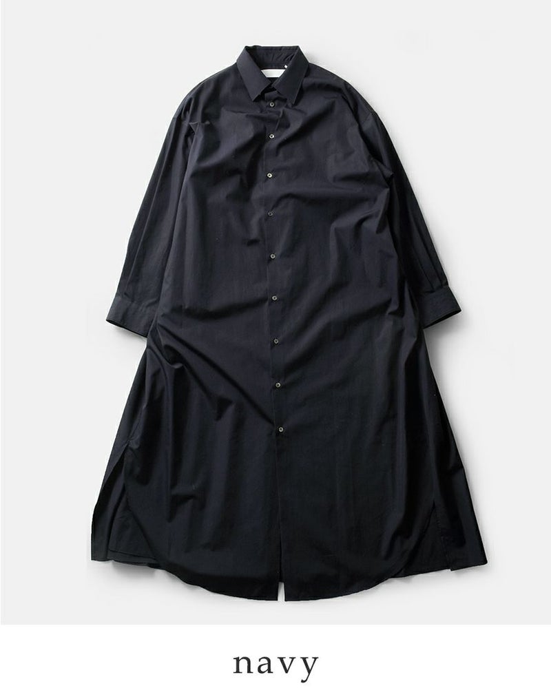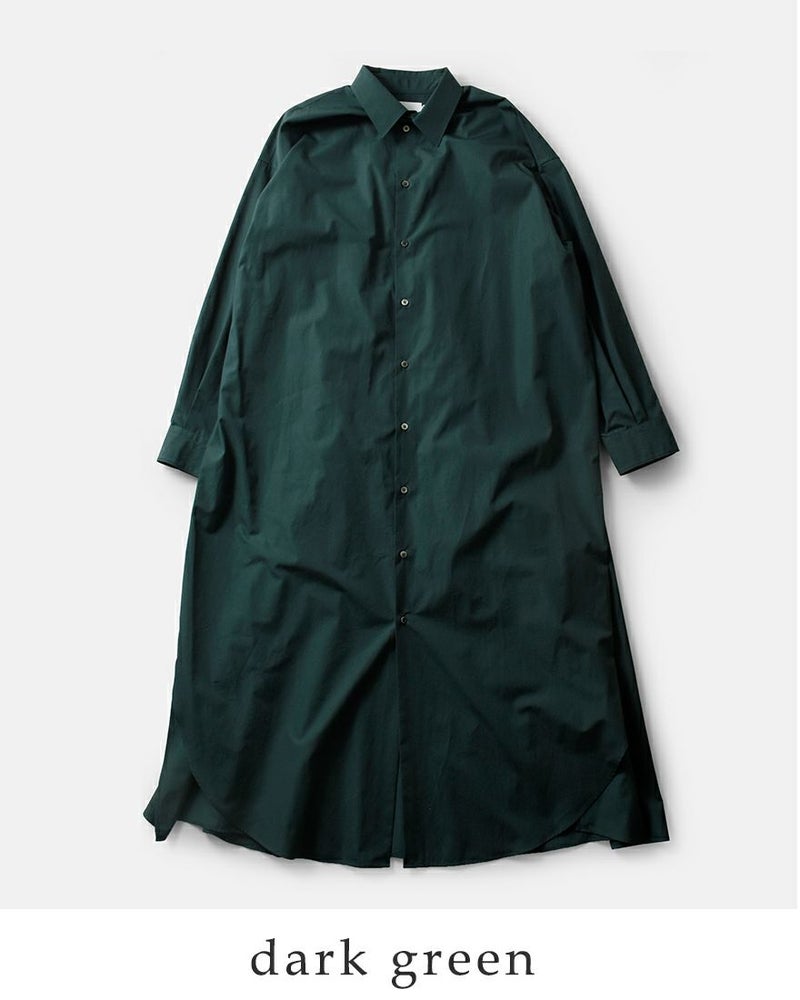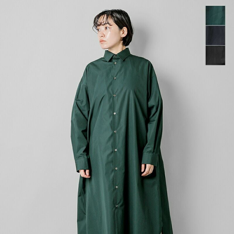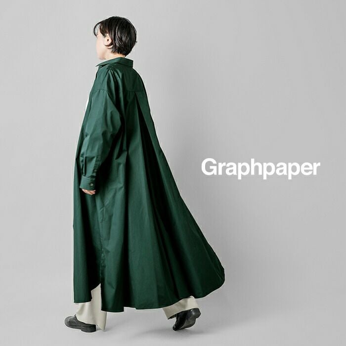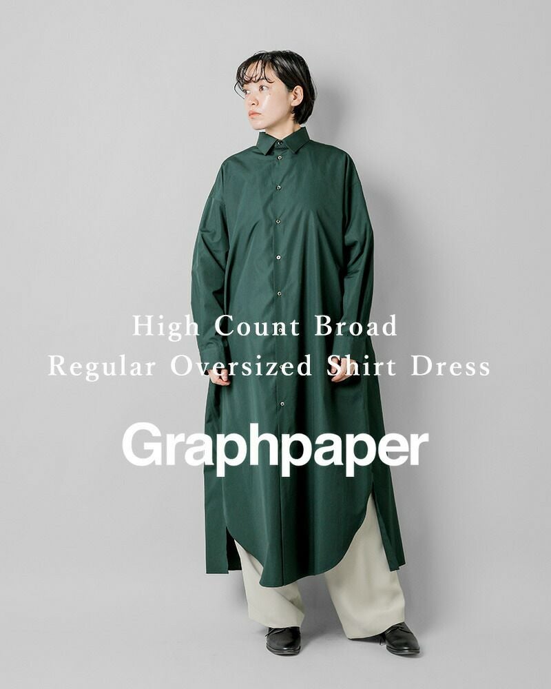 graphpaper(グラフペーパー)よりハイカウント ブロード オーバー シャツワンピース “High Count Broad Regular Oversized Shirt Dress”のご紹介です。しなやかで適度な光沢感を放つスーピマコットンを用いて限界に近い密度に織り上げたクリアな表情とハリ感が特徴のハイカウントブロードを使用したシャツワンピース。オーバーサイズで、背中のインバーテッドプリーツが動きとともに広がり、エレガントな雰囲気を醸し出します。前後差寸のあるヘムラインが足さばきの良さを実現し、ちらりと見せるボトムで個性を主張できるデザインです。フロントのボタンの留め具合で雰囲気を変えて楽しめるアイテムです。