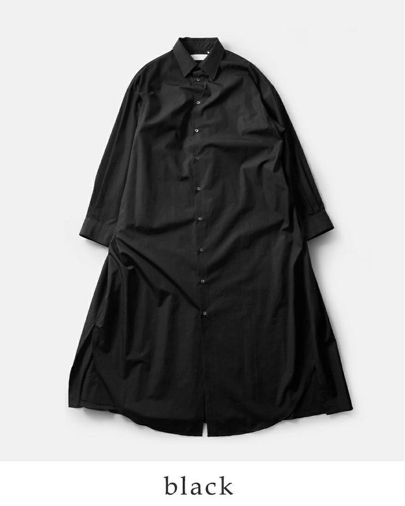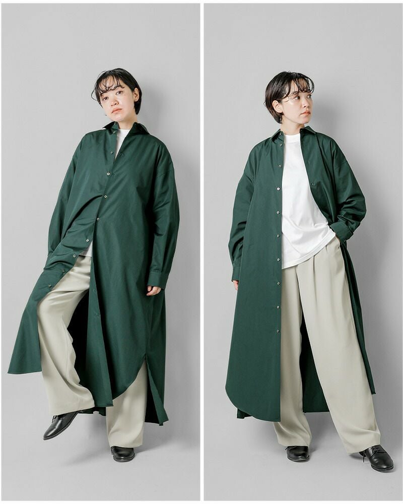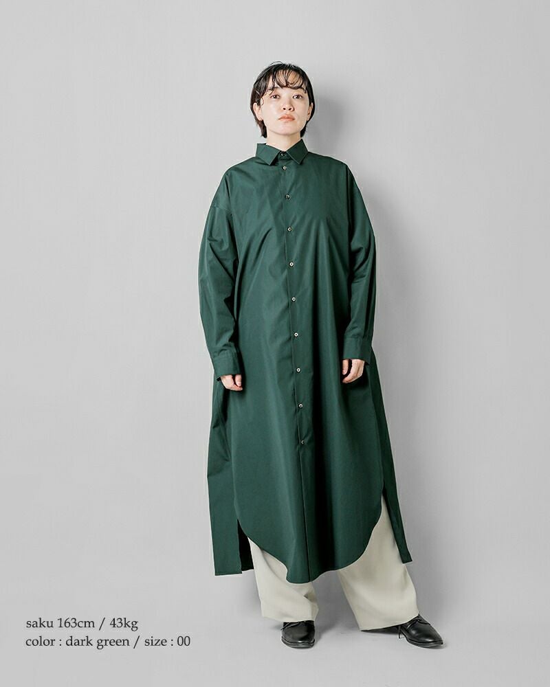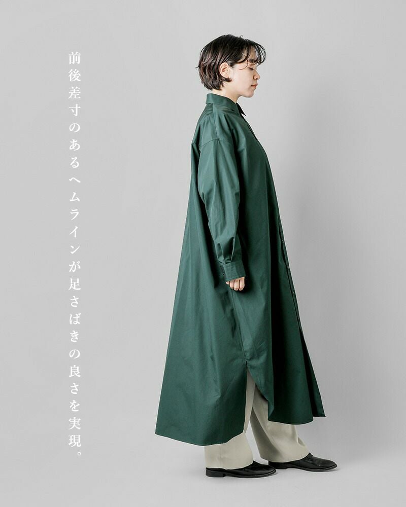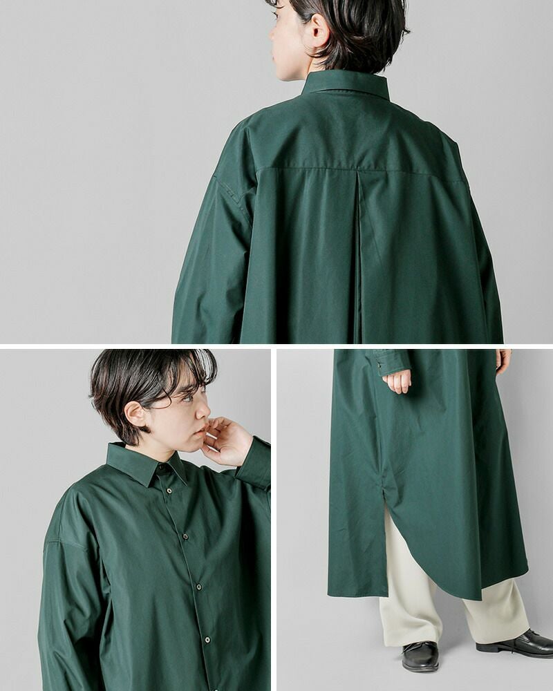 graphpaper(グラフペーパー)よりハイカウント ブロード オーバー シャツワンピース “High Count Broad Regular Oversized Shirt Dress”のご紹介です。しなやかで適度な光沢感を放つスーピマコットンを用いて限界に近い密度に織り上げたクリアな表情とハリ感が特徴のハイカウントブロードを使用したシャツワンピース。オーバーサイズで、背中のインバーテッドプリーツが動きとともに広がり、エレガントな雰囲気を醸し出します。前後差寸のあるヘムラインが足さばきの良さを実現し、ちらりと見せるボトムで個性を主張できるデザインです。フロントのボタンの留め具合で雰囲気を変えて楽しめるアイテムです。