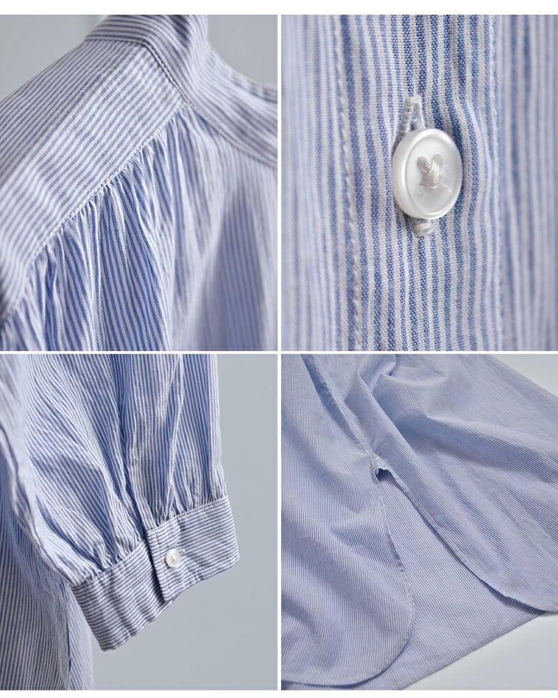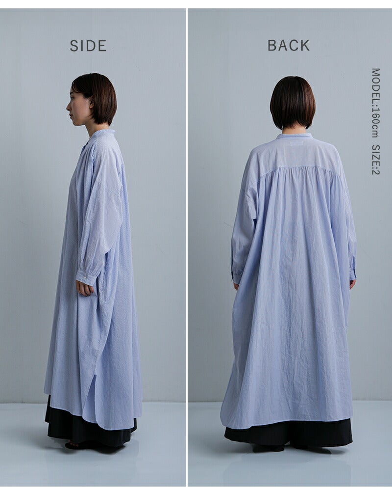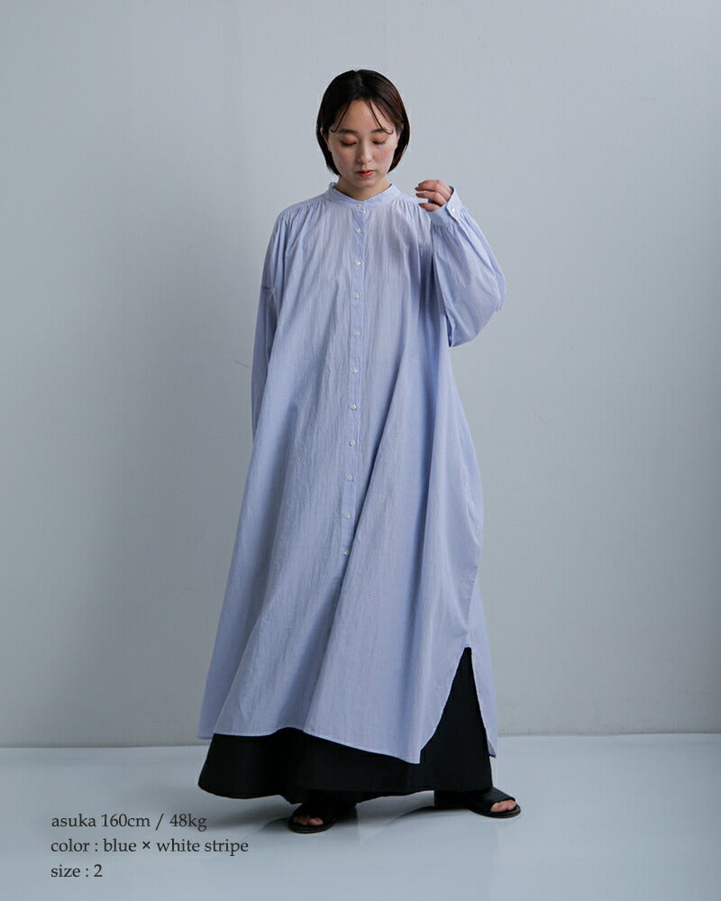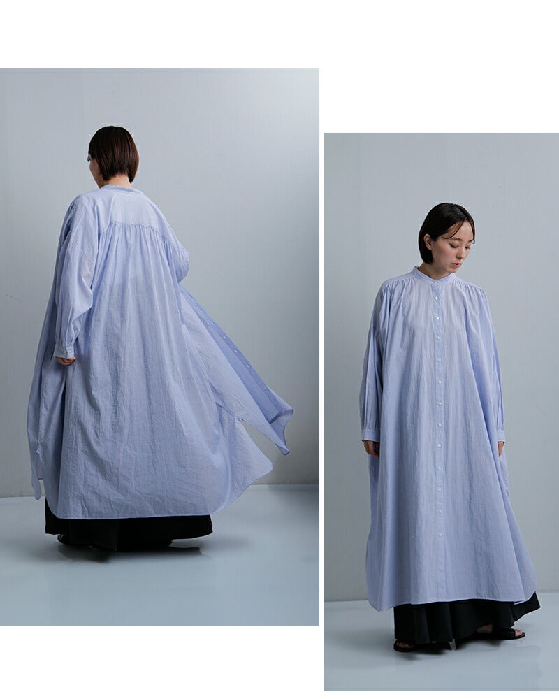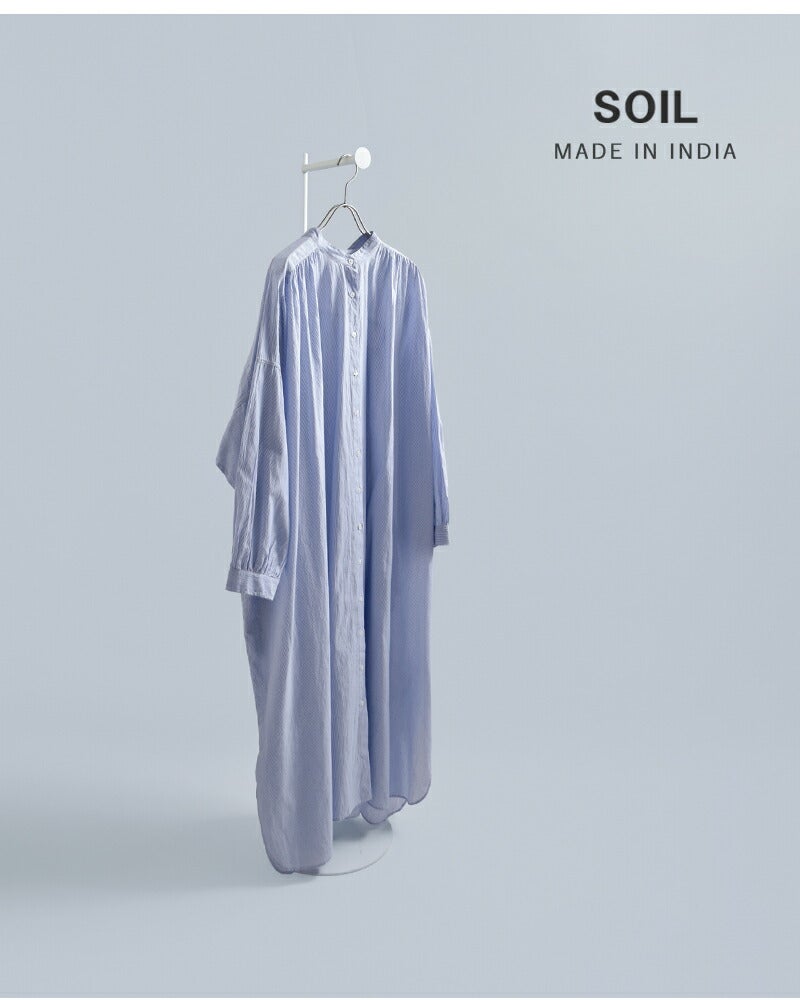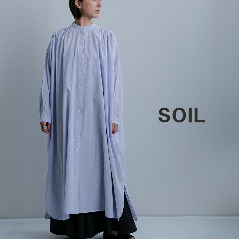 SOIL(ソイル)より、コットンボイル ストライプ バンドカラー ギャザー シャツドレスのご紹介です。 ロング丈で、一枚でスタイリングが完成するシャツドレス。 前後に施された繊細なギャザーが、動くたびにふわりと揺れ、軽やかなドレープ感を生み出します。 肩まわりから後ろ身頃にかけて広がる程よいボリュームが、やさしく女性らしい印象に。 ゆったりとした身幅でリラックス感のある着心地ながら、すっきりとしたバンドカラーが全体を上品に引き締めてくれます。