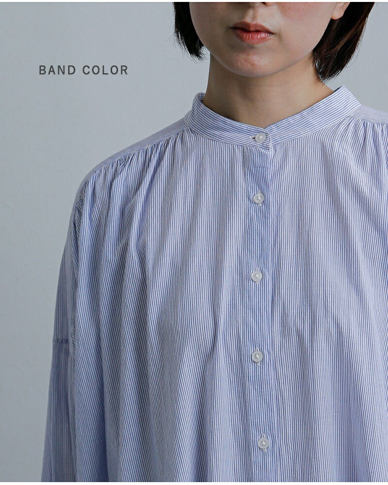 首元はすっきりとしたバンドカラーで、上品な印象に。 肩まわりには細かなギャザーをあしらい、さりげない可愛らしさと、自然に流れるやわらかなドレープを演出します。