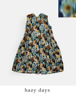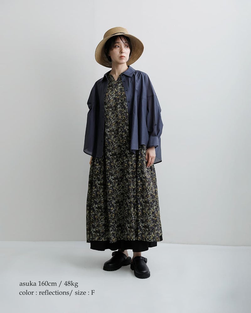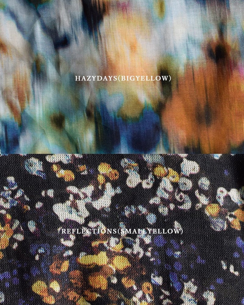 リバティプリントならではの繊細で奥行きのある色彩。優れた吸湿性と放湿性をもち、なめらかな肌触りと上品な光沢、そして美しいドレープ性が特徴。植物由来のため生分解性を持ち、環境にもやさしい素材。集めた花々が、時間の中でゆっくりと滲んでいく。「Reflections」には記憶の光が、「Hazy Days」には霞のような残り香がある。どちらも、失われながらも残り続ける“花の痕跡”。