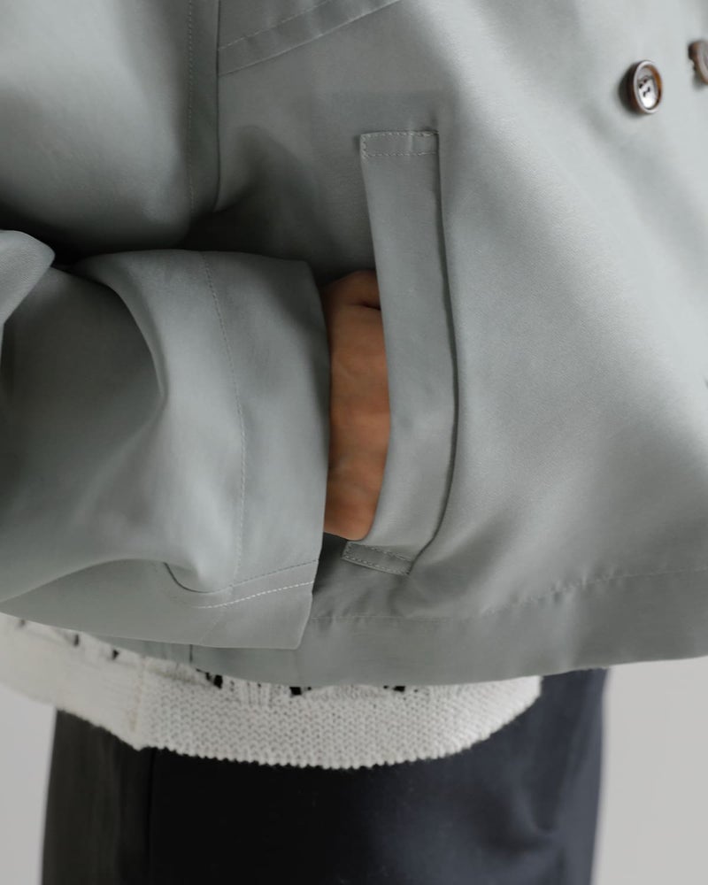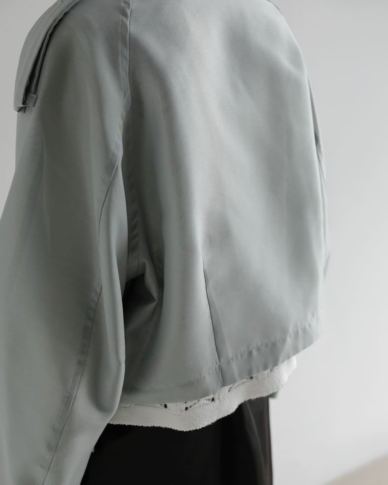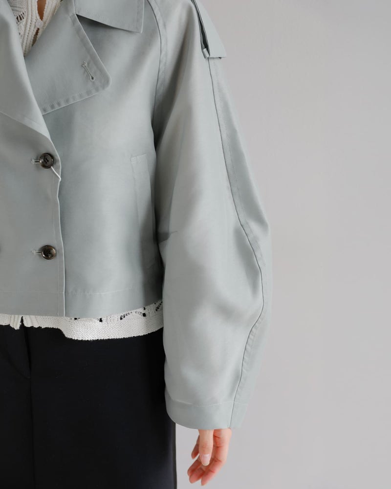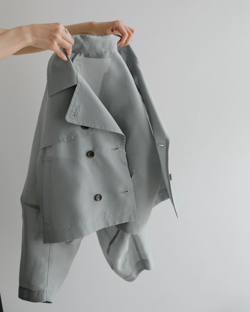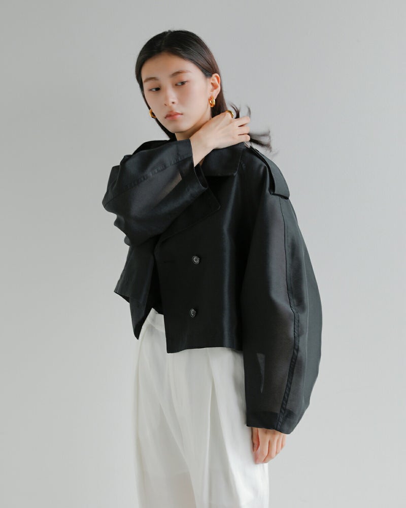 シアーによる抜け感と、トレンチディテールのきちんと感が共存したモードな雰囲気。軽やかでありながら落ち着きもあり、大人っぽく着られる一枚。