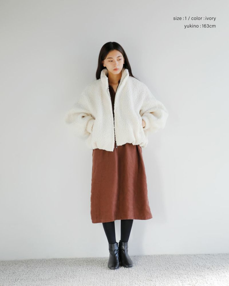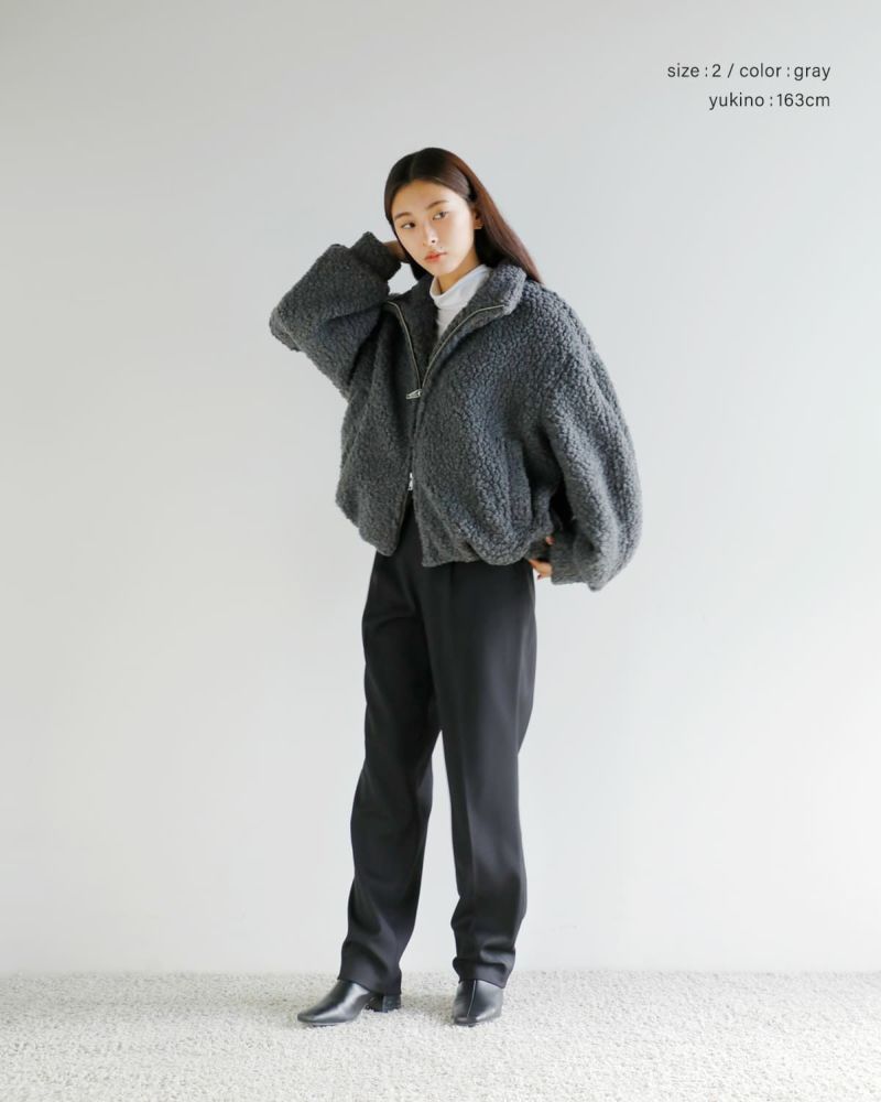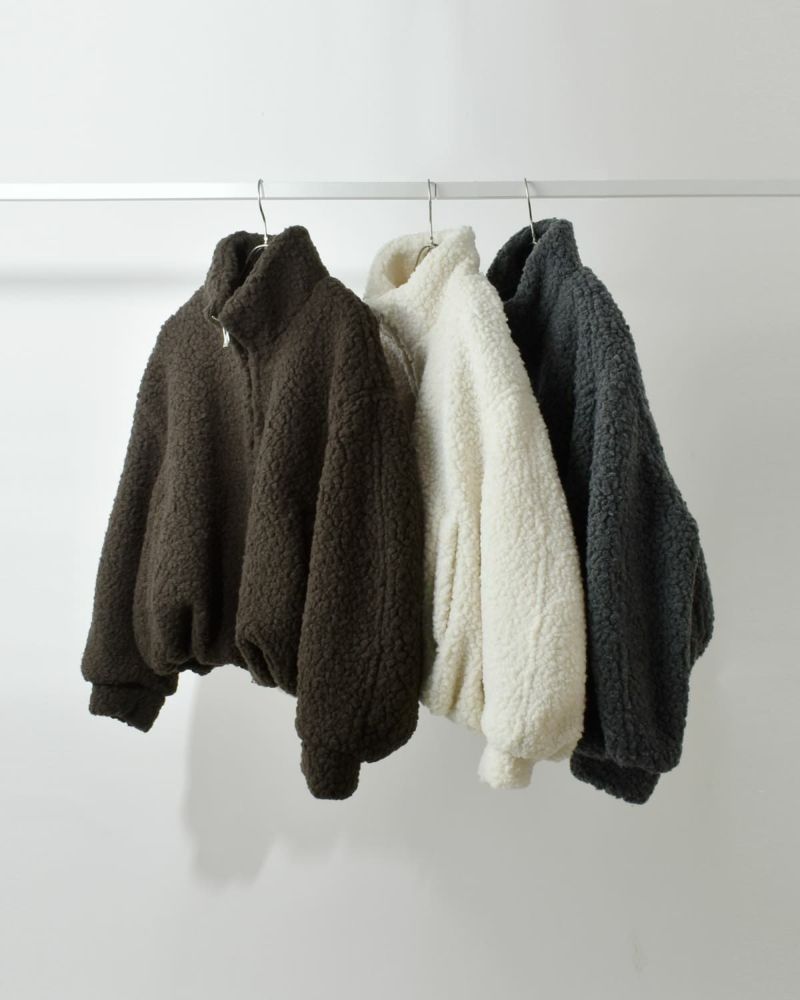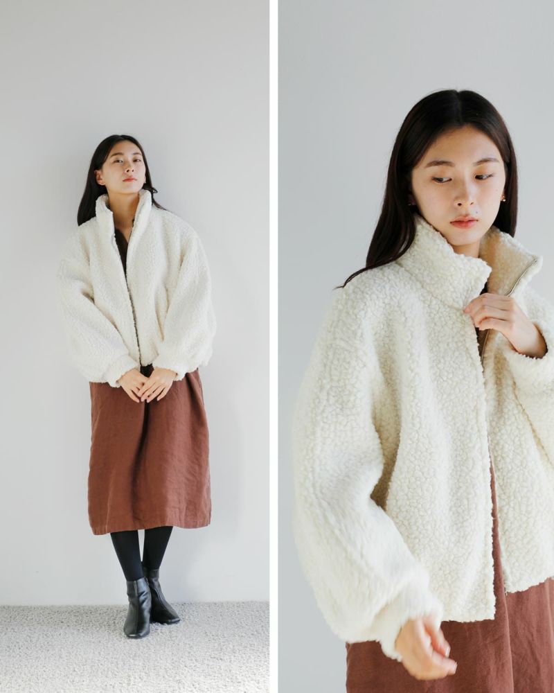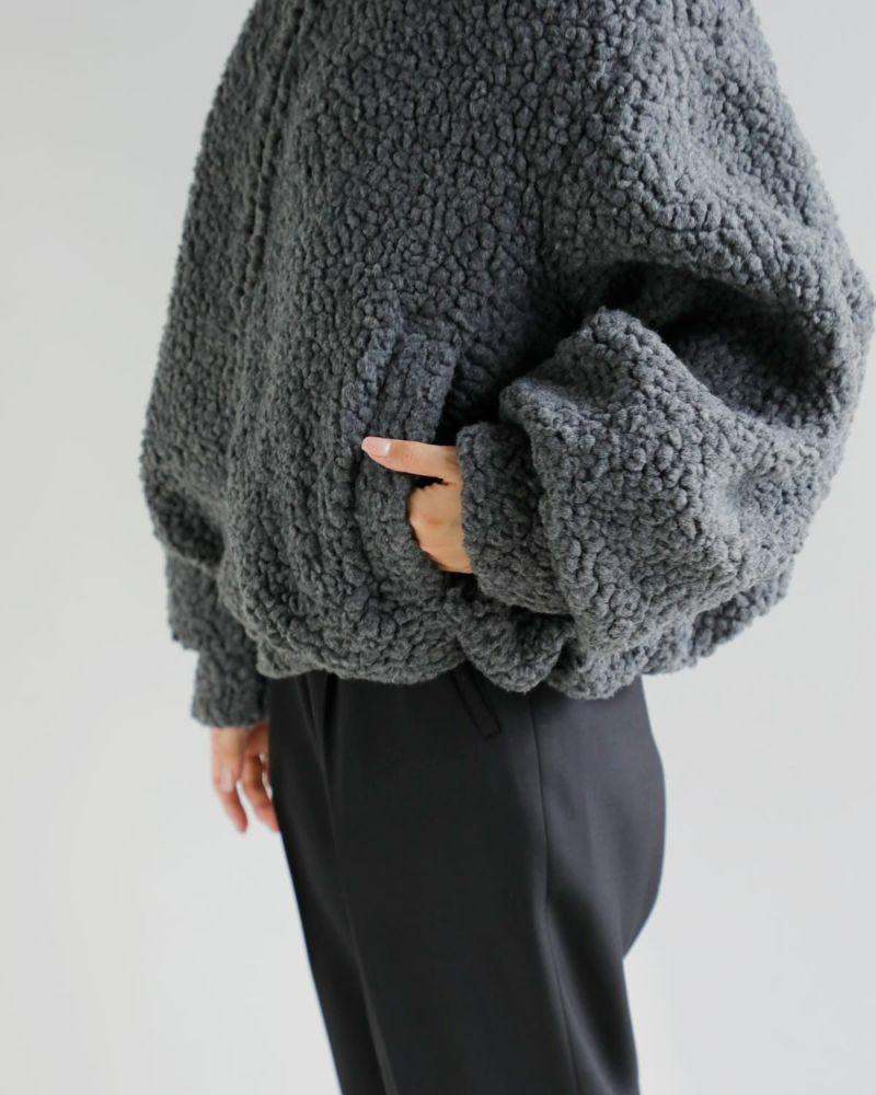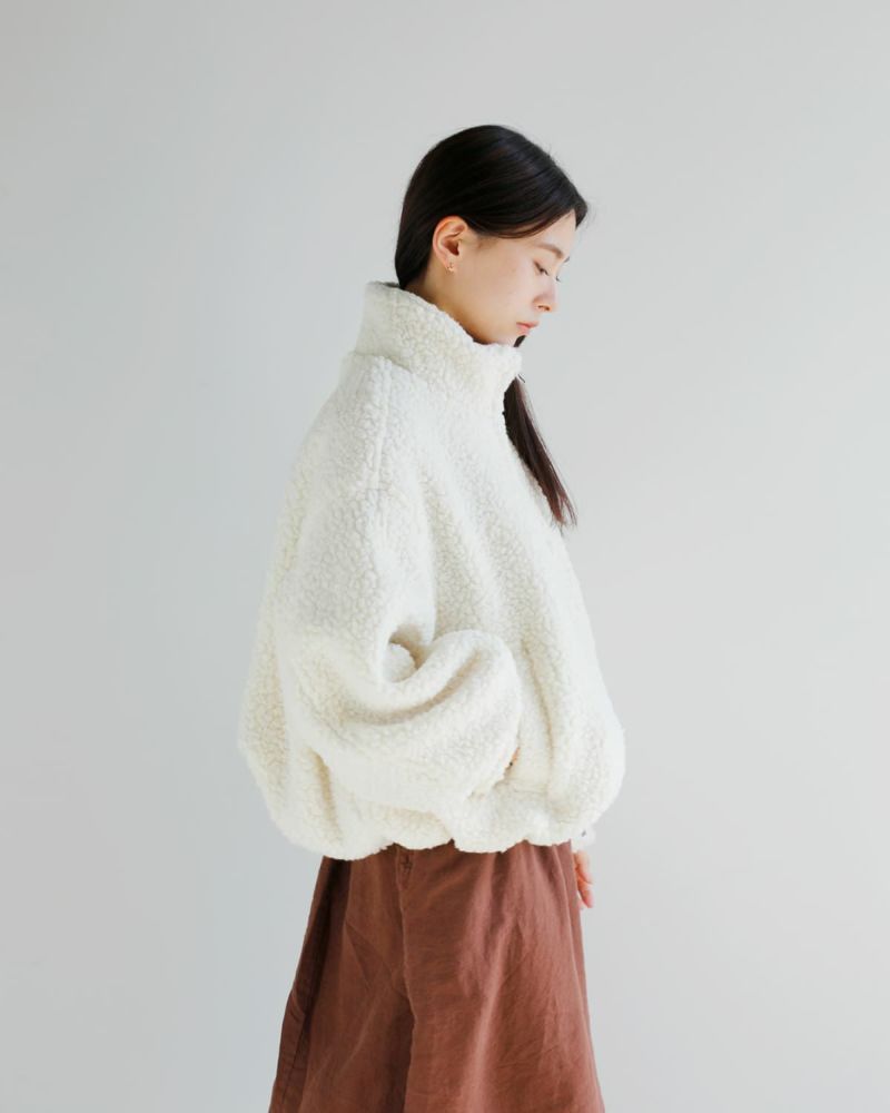 毎年ご好評いただいているボア素材のアウターを、今季はふっくらとした表情が魅力のボアブルゾンとして登場。暖かく保温性に優れたウール混素材を使用し、大粒のボアでボリューム感がありながらも軽やかに仕上げました。自然な光沢と滑らかな毛並みが、高級感のある印象を引き立てます。肩を落としたワイドなフォルムと、CLANEらしい丸みのあるシルエットにこだわり、着丈はやや短めに設定。トレンド感のあるバランスに仕上げています。スタンドカラーで首元までしっかりと暖かく、両脇のポケットはニット裏地付きで防寒性も◎。冬のスタイリングに映える、存在感のある一着です。