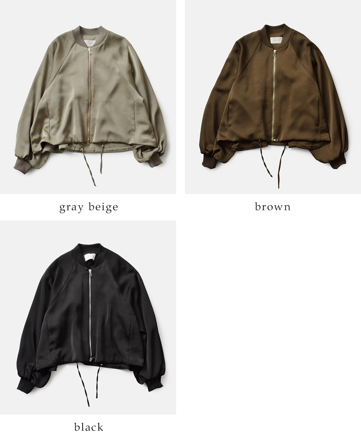 滑らかなサテン素材が上品な印象のブルゾン。ふんわりボリューミーなお袖がトレンド感のある装いを演出します。裾のドローコードを絞ることで、シルエットの変化も楽しめます。紐はそのまま垂らして、ラフな着こなしにしても◎光沢の美しいサテン素材で、カジュアルなジップブルゾンを女性らしく華やかな雰囲気で着ていただけます。両サイドにポケット付き。