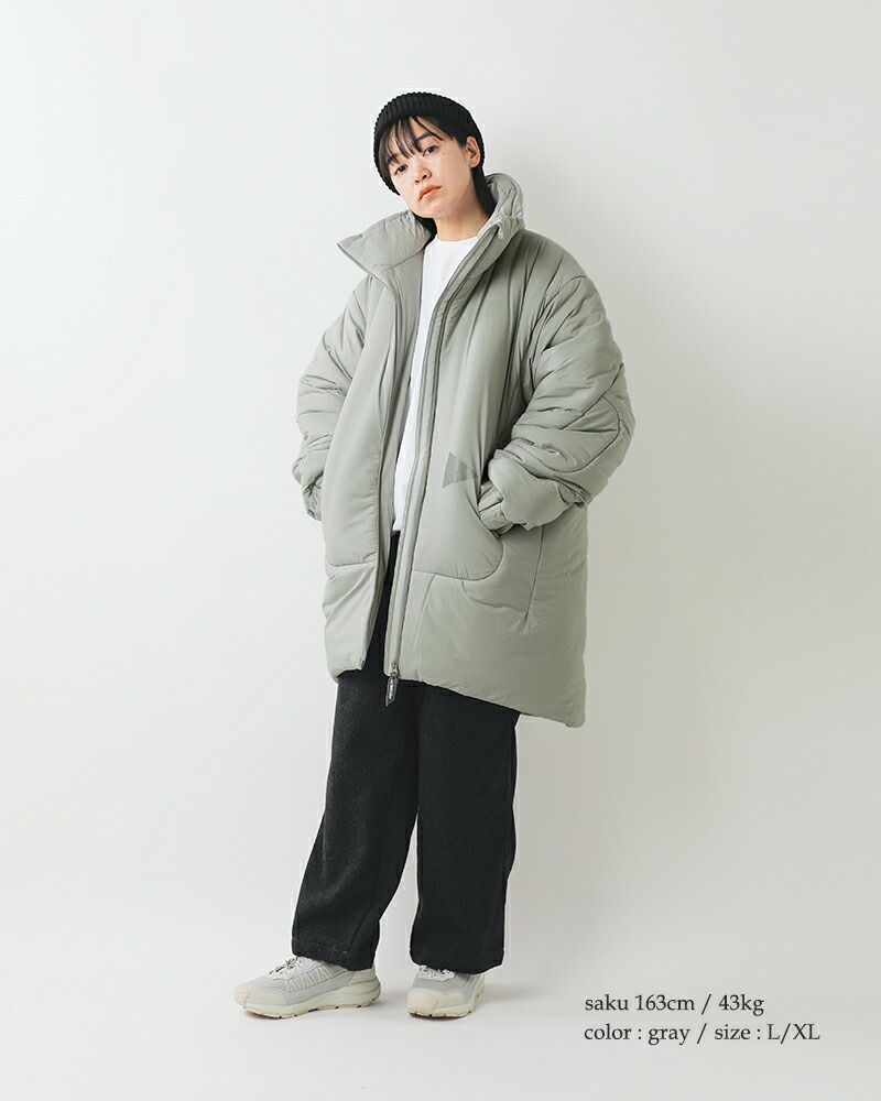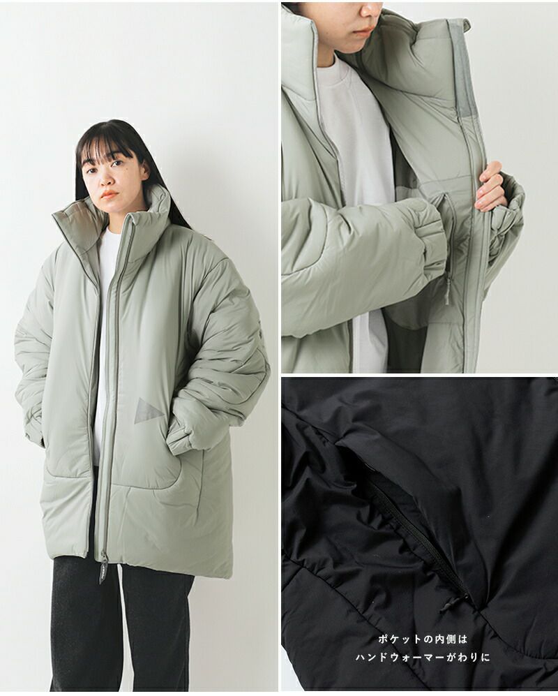 水に濡れても暖かく、通気性があり、耐久性とロフト性の維持を可能にしたインサレーションを使用した、機能性とスタイリッシュなデザインを兼ね備えたコート。ゆったりとしていますが、着ぶくれしないよう計算されたシルエットです。長めの着丈でとても暖かなコートです。