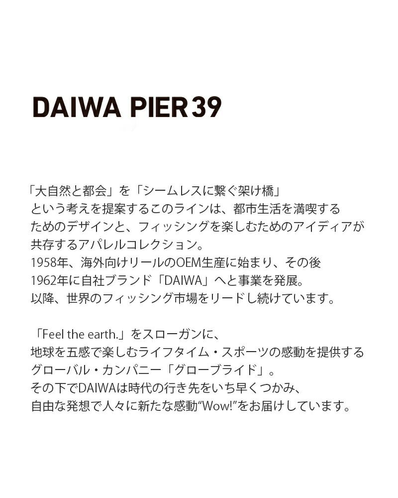 「大自然と都会」を「シームレスに繋ぐ架け橋」 という考えを提案するこのラインは、都市生活を満喫する ためのデザインと、フィッシングを楽しむためのアイディアが 共存するアパレルコレクション。 1958年、海外向けリールのOEM生産に始まり、その後 1962年に自社ブランド「DAIWA」へと事業を発展。 以降、世界のフィッシング市場をリードし続けています。