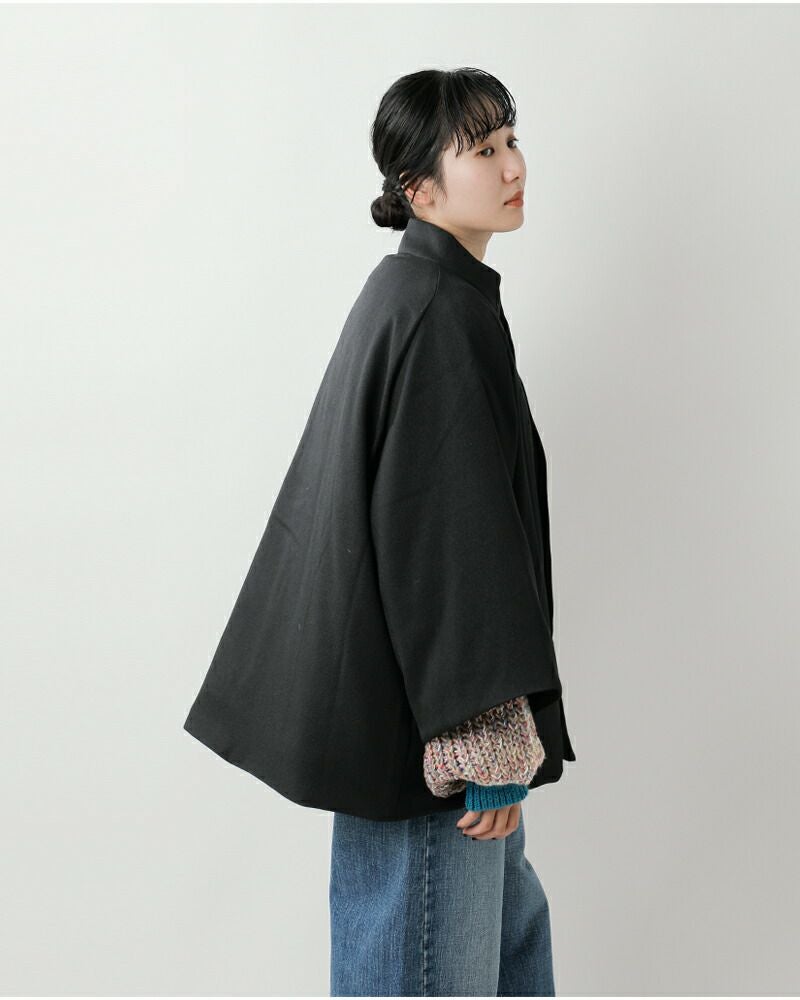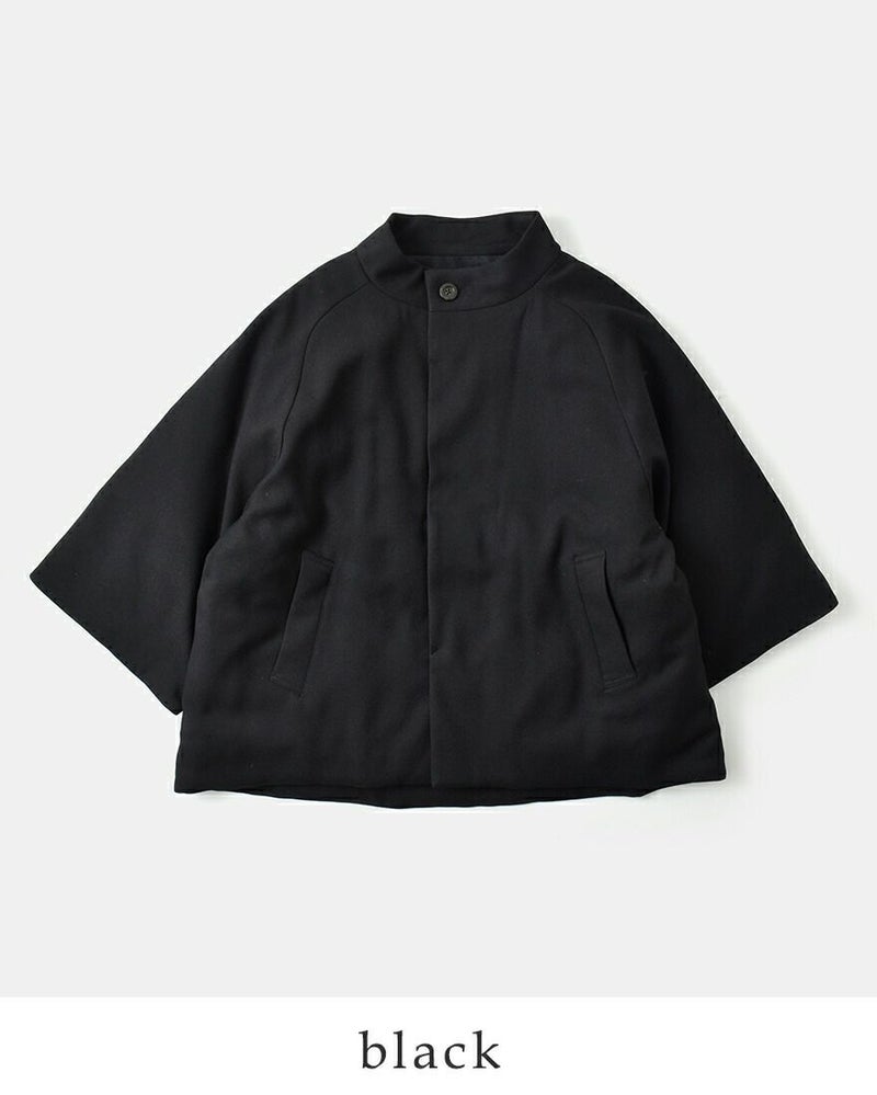 miffew(ミフュー)より、ケープ ダウン コート “CAPE DOWN COAT”のご紹介です。ケープのようなルックスのシンプルなAラインコート。身頃と袖がそれぞれやや短めでゆったりとした作りなので、手袋などの冬小物を合わせやすく、ボリュームのあるニットの上からでもストレスなく羽織れます。