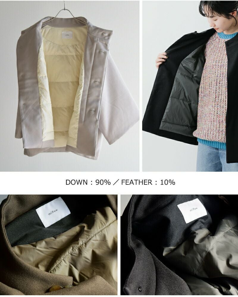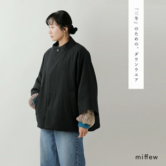 「miffew」 が目指すのは、 トレンドやジェンダーを超え、 服を纏う人の日常と個性に寄り添う、 「三冬」のためのダウンウエア。 服飾デザインの歴史に残る 普遍的なアーカイブを再構築するだけでなく、 新しいカタチに最高品質の国産ダウンを内包することで、 ダウンウエアを都市生活者のワードローブとして プレゼンテーション。そのオーセンティックな佇まいからは、 想像もつかない驚きの軽さと暖かさ。 袖を通した瞬間に感じる、 心地いい裏切りを大切に、 高揚感が永く続くナラティブなコレクションを 展開していきます。