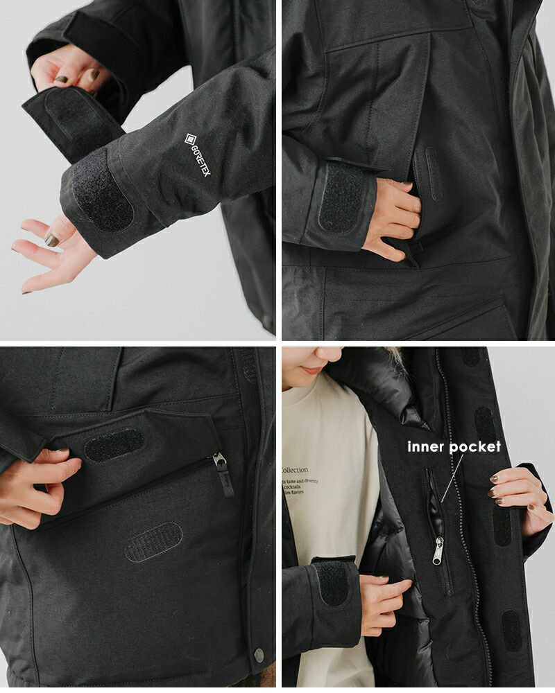・袖口はテープでサイズ調整でき、グローブがつけやすい仕様。中は冷気や風の浸入を防ぐリブで手首にフィットします。 ・フロントに配備されたポケットは、ファスナーにテープ付きのフラップが付きます。さらに左身頃の内側にはジップ付きインナーポケットを配置しています。