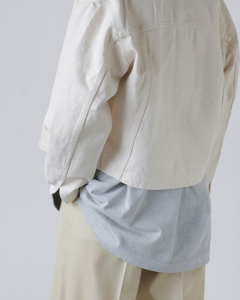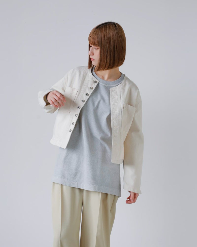 素材の選定から染色までを一貫して行い、高い耐久性と奥行きのある陰影が特徴のデニムを完成させています。コンパクトな着丈にドロップショルダーでバランスを取り、存在感のあるメタルネオバーボタンを多数配したミニマルながらも印象的なデザイン。