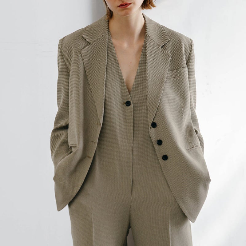 アセテートをベースにした素材は、しなやかな落ち感とほのかな光沢が特徴。スーツほど堅すぎず、コットンチェックほどカジュアルでもない絶妙なバランスが、大人の女性らしさと品のある高級感を引き立てます。