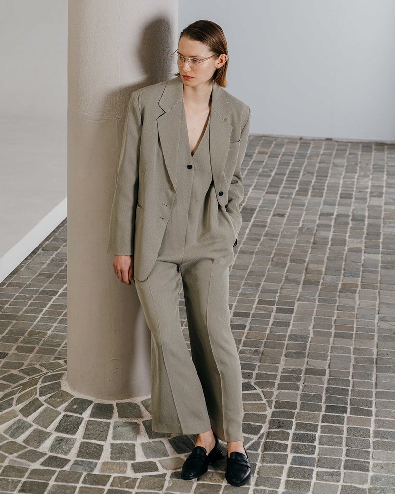 70年代より女性らしさと強さ、エレガンスを同時に表現できる服として認識されてきたジャンプスーツの流れを感じさせる佇まいも魅力です。