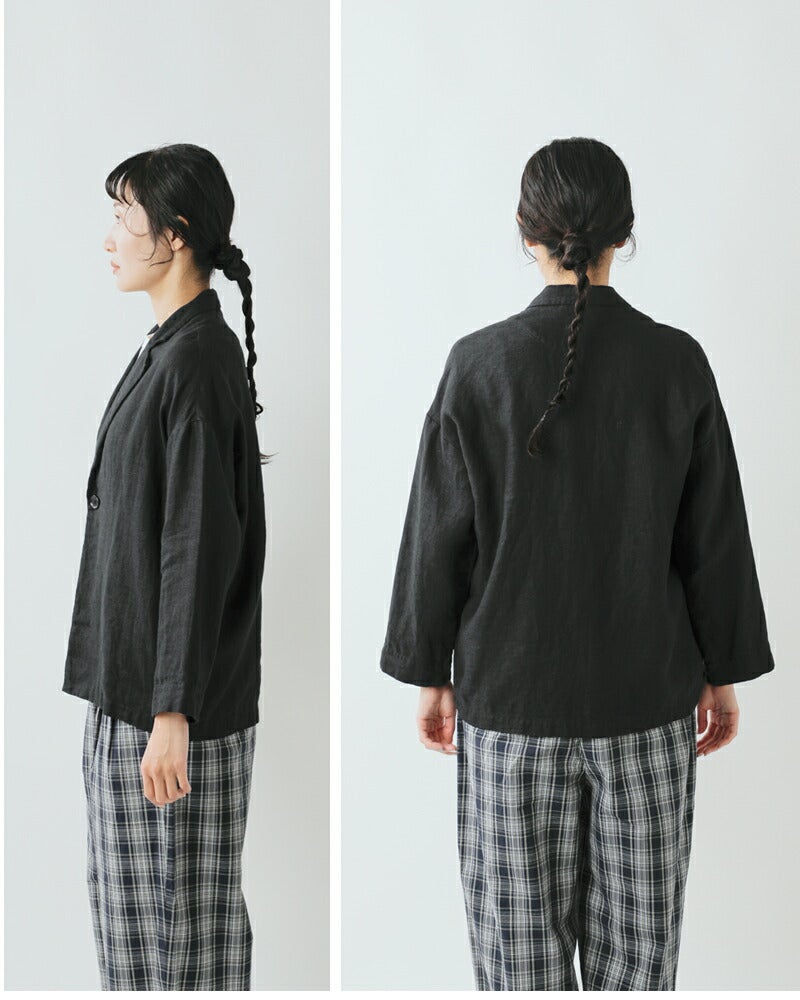 上質なリネン素材を使用し、丁寧な仕立てで仕上げました。洗いざらしの風合いがこなれた雰囲気を演出します。かっちりしすぎず、自然体で着ていただけて、ワードローブに1つあると重宝します。