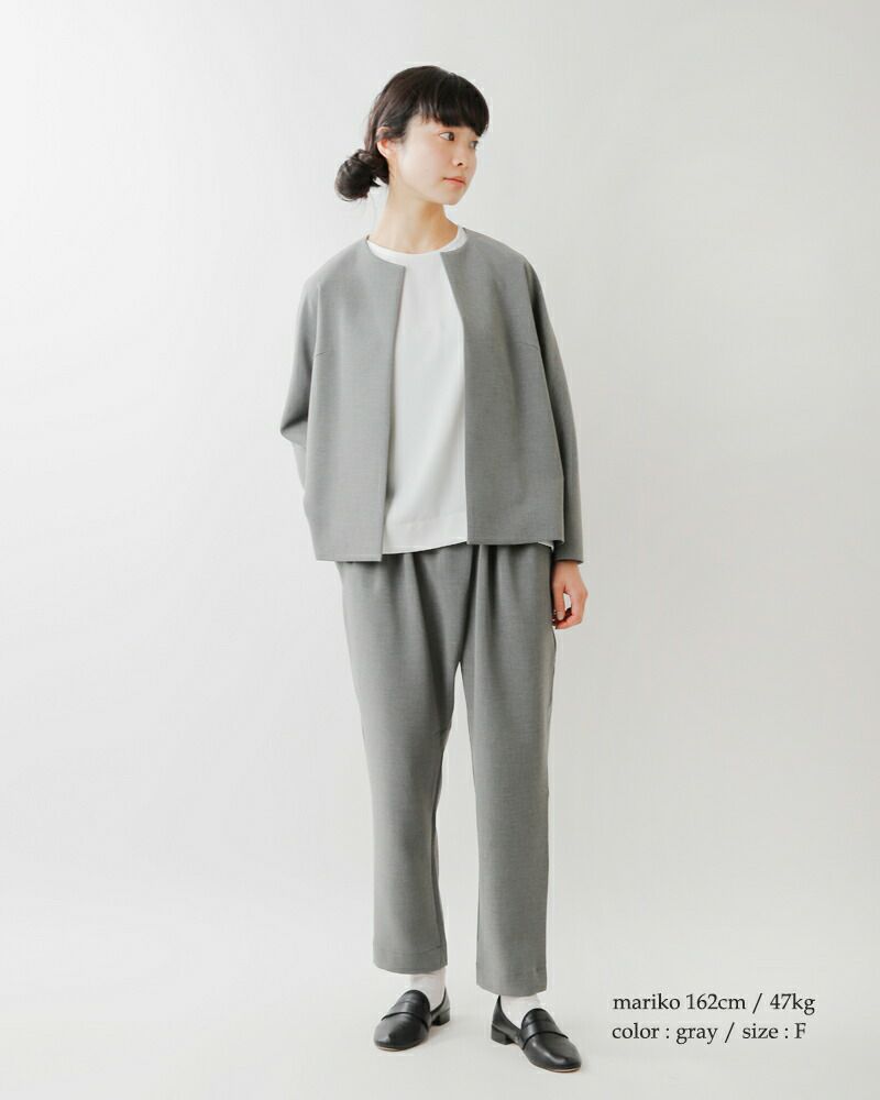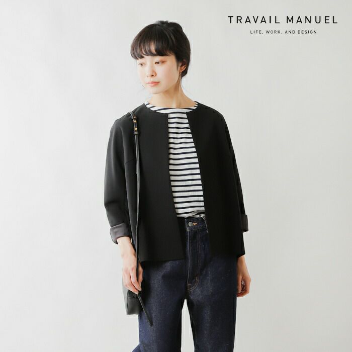 TRAVAIL MANUEL(トラバイユマニュアル)より、ダブルクロスノーカラージャケットのご紹介です。ダブルクロスと呼ばれる落ち感がきれいな生地を使用した大人っぽい一着。ノーカラーの襟元や、ボタンがないためゆったりとしたシルエットなどリラックス感のあるデザインも魅力的です。フォーマルシーンにも普段使いにも◎。ON/OFF問わず着て頂けるので同素材のパンツとのセットアップスタイルもおススメです。