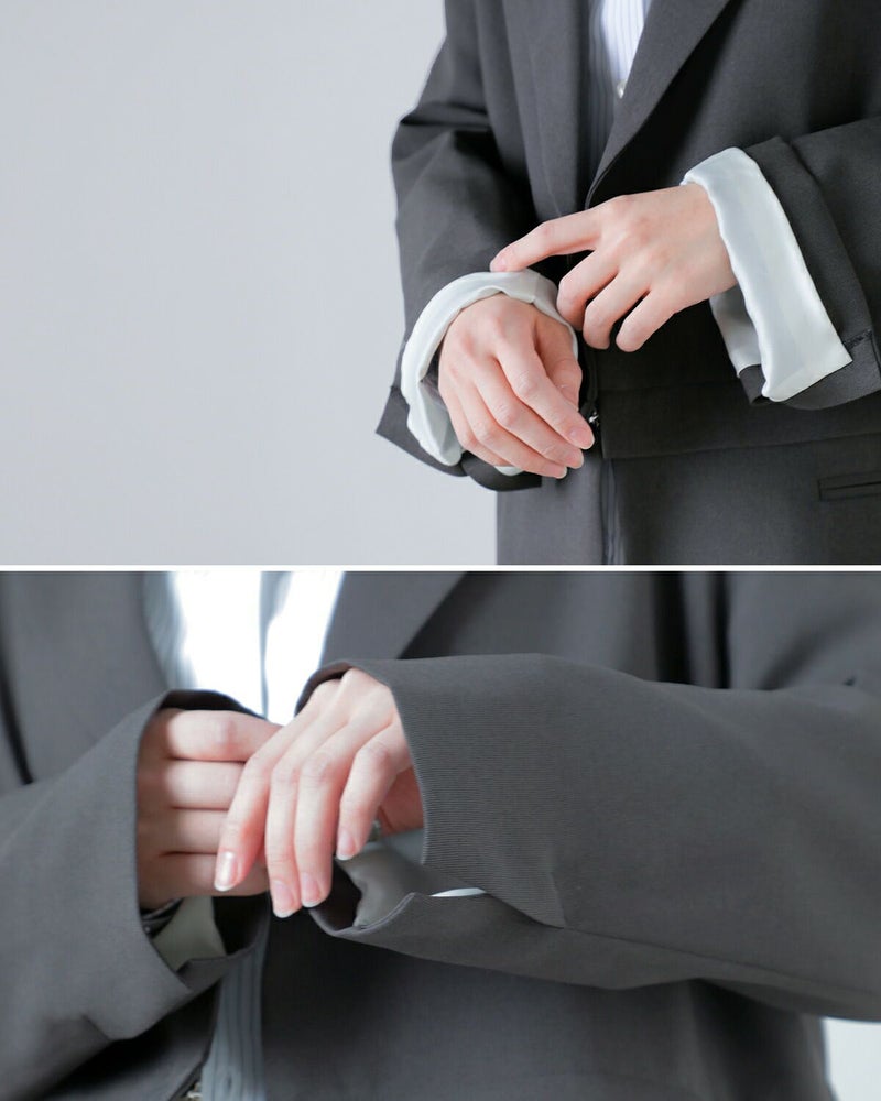 オンもオフも、スタイルに合わせてアレンジできる2WAYジャケット。ウエストのジップで裾を取り外せば、ショート丈のジャケットとしても着用できるデザインです。すっきりとした襟元が洗練された印象を与え、メンズライクなシルエットでありながら、女性らしい上品さも兼ね備えています。
