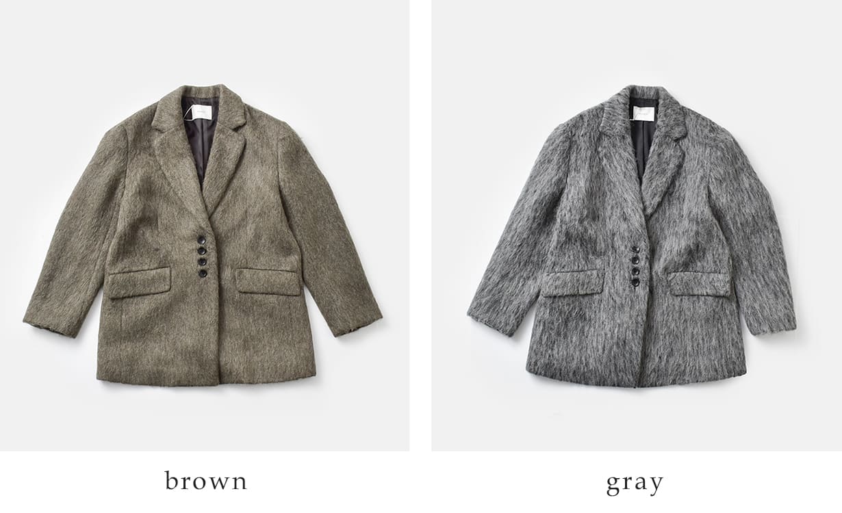 奥行きのあるミックスカラーが目を惹く、軽く羽織れるシャギー素材のテーラードジャケットコート。ふんわりとした毛足が生み出す柔らかな風合いとリッチな表情が魅力で、羽織るだけで季節感をまとえる一着です。ミックスカラーの絶妙な濃淡が立体感を演出し、上品さとこなれ感を両立。ウール混のシャギー素材を使用し、程よく構築されたオーバーサイズのテーラードフォルムがきちんと感も添えつつ、柔らかな素材とのバランスでこなれた印象に仕上げています。